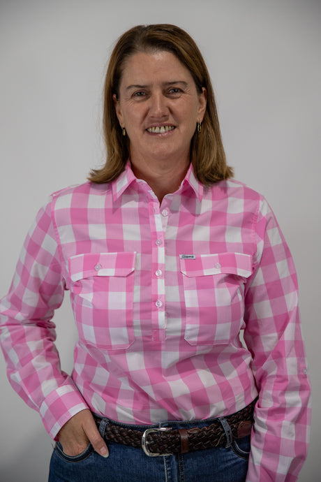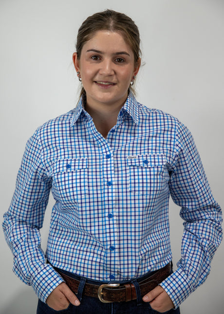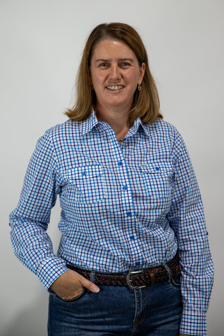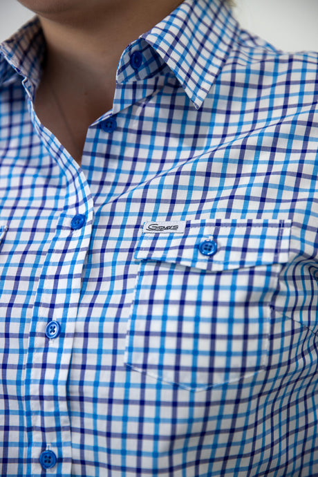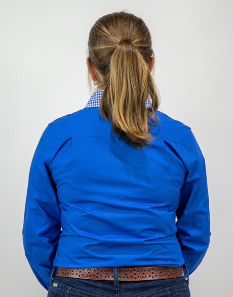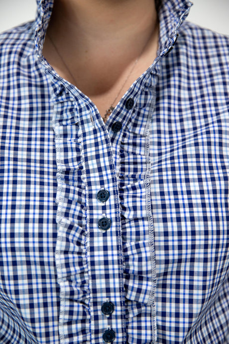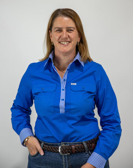 Beth - 1/2 Button Front Blue with Gingham trim Long Sleeve Cotton Collared Shirt