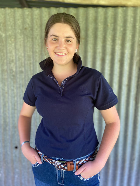 Naomi - Navy Ruffle Polo Shirt with striped trim