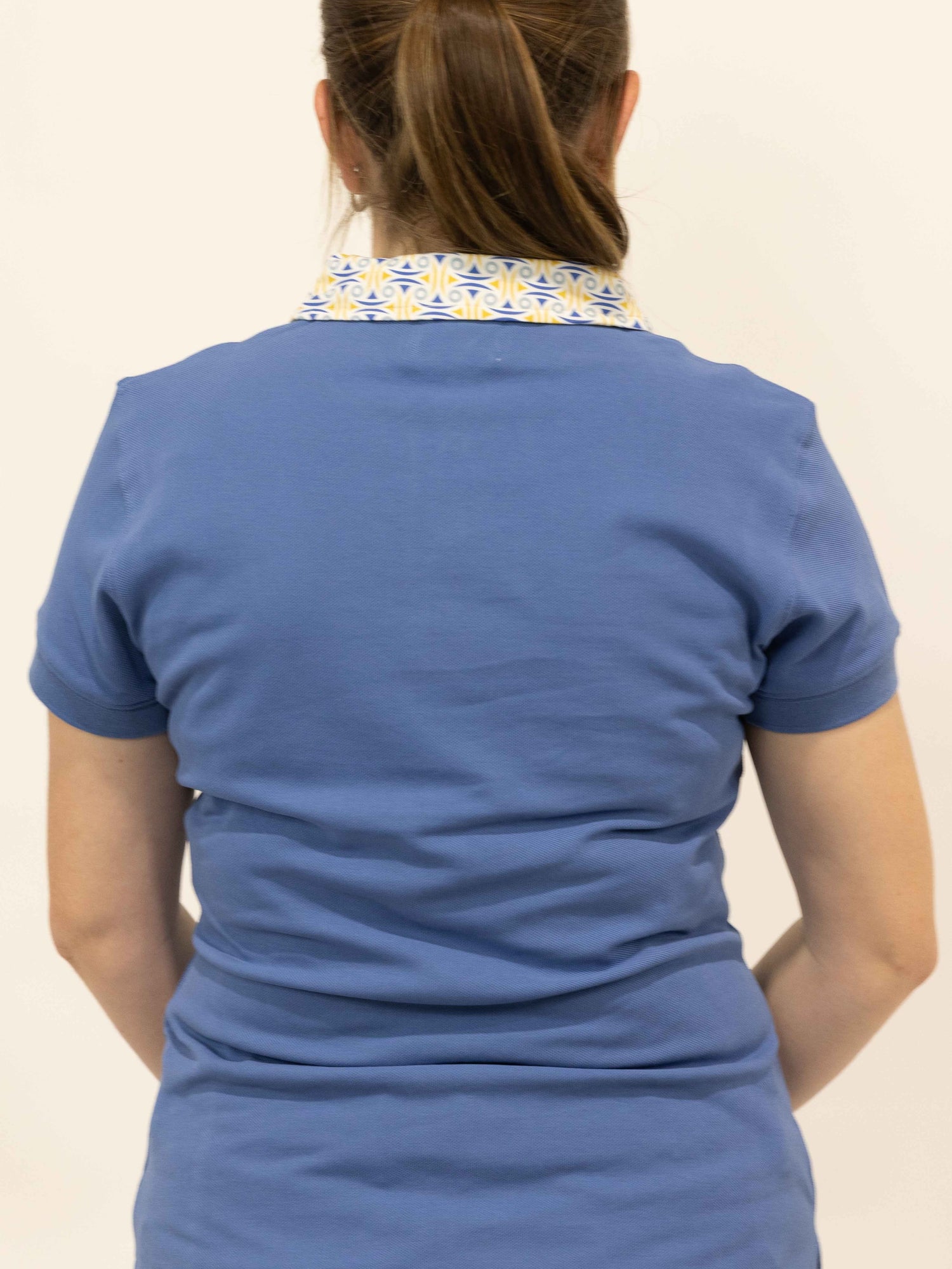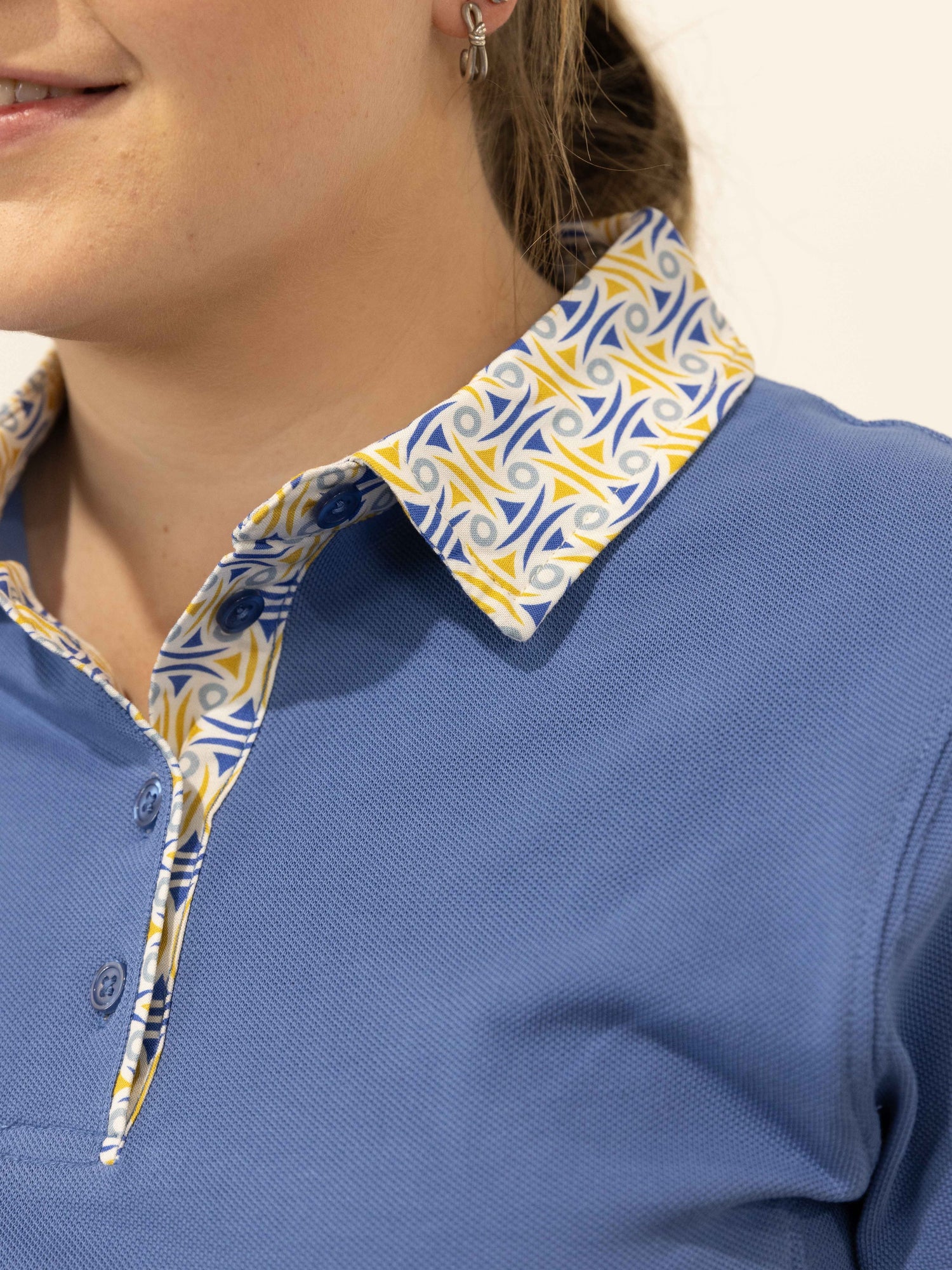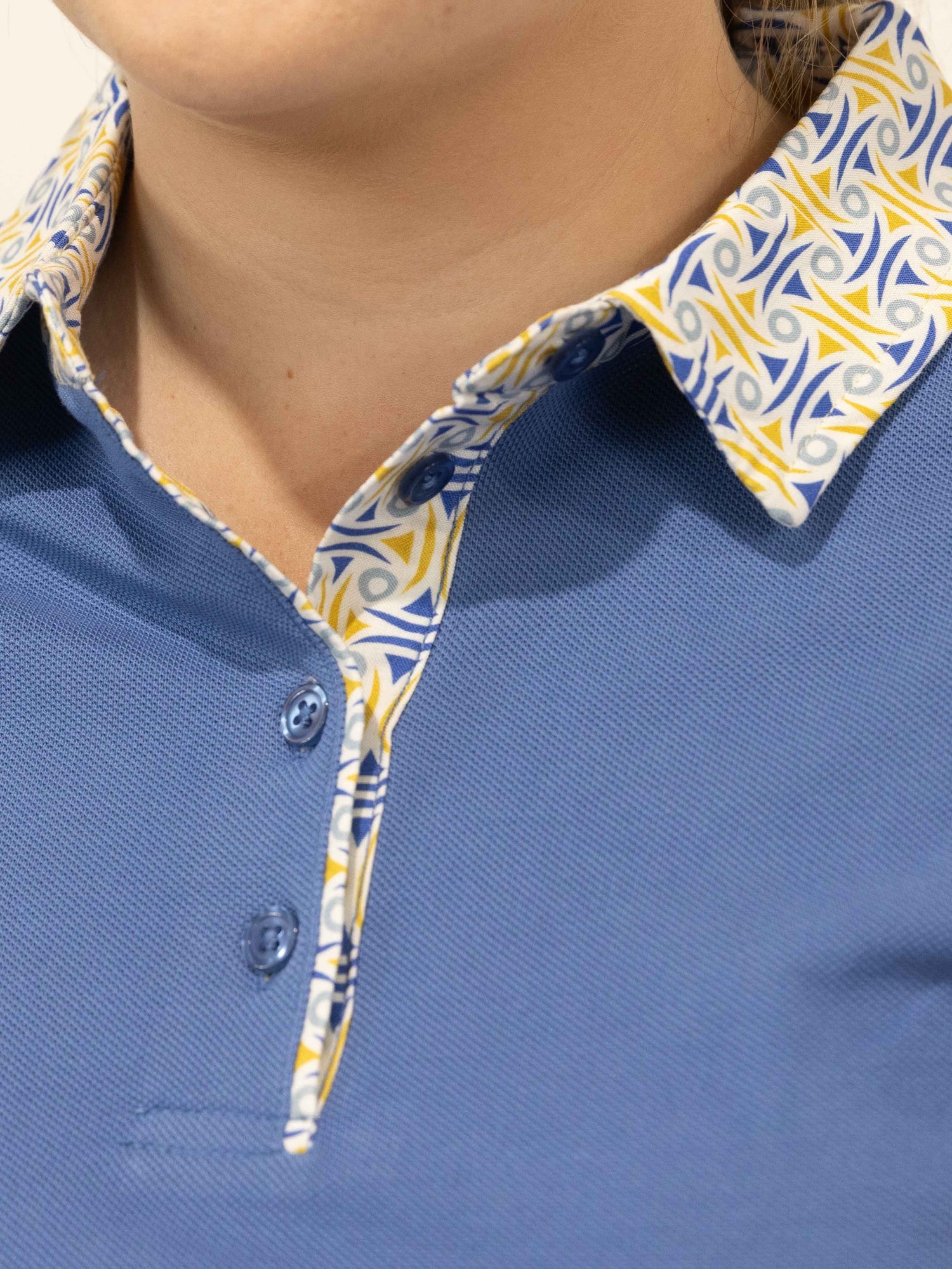 Brielle is a lovely soft shade of blue with grey, mauve undertones short sleeve polo with contrasting abstract pattern on the collar and placket opening. Buttons and colour matched blue.