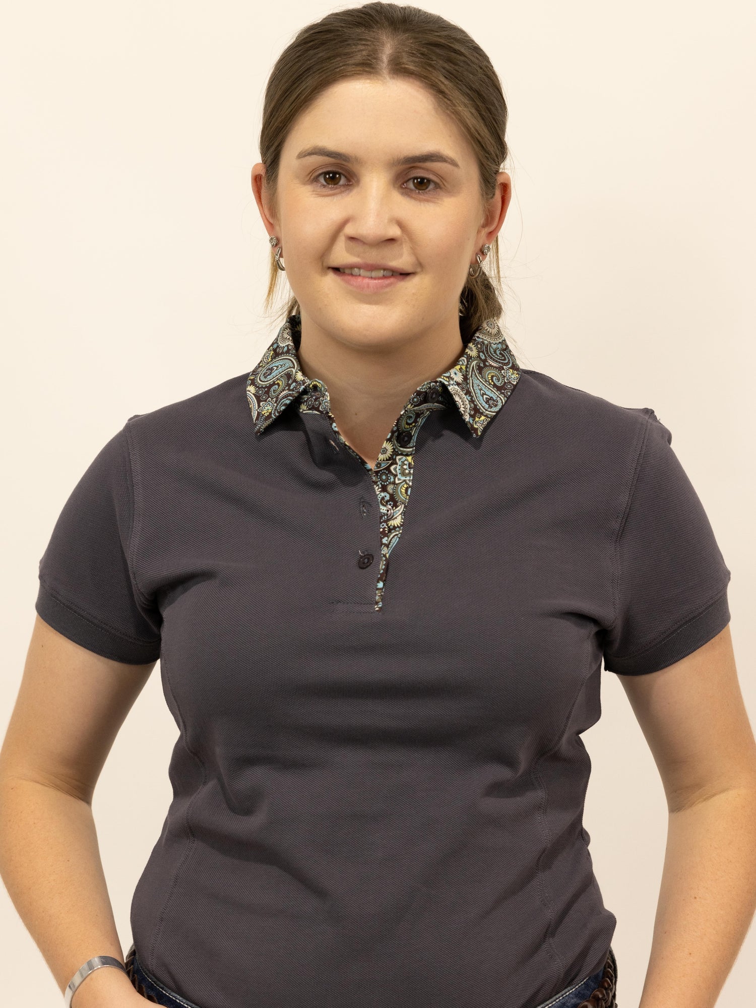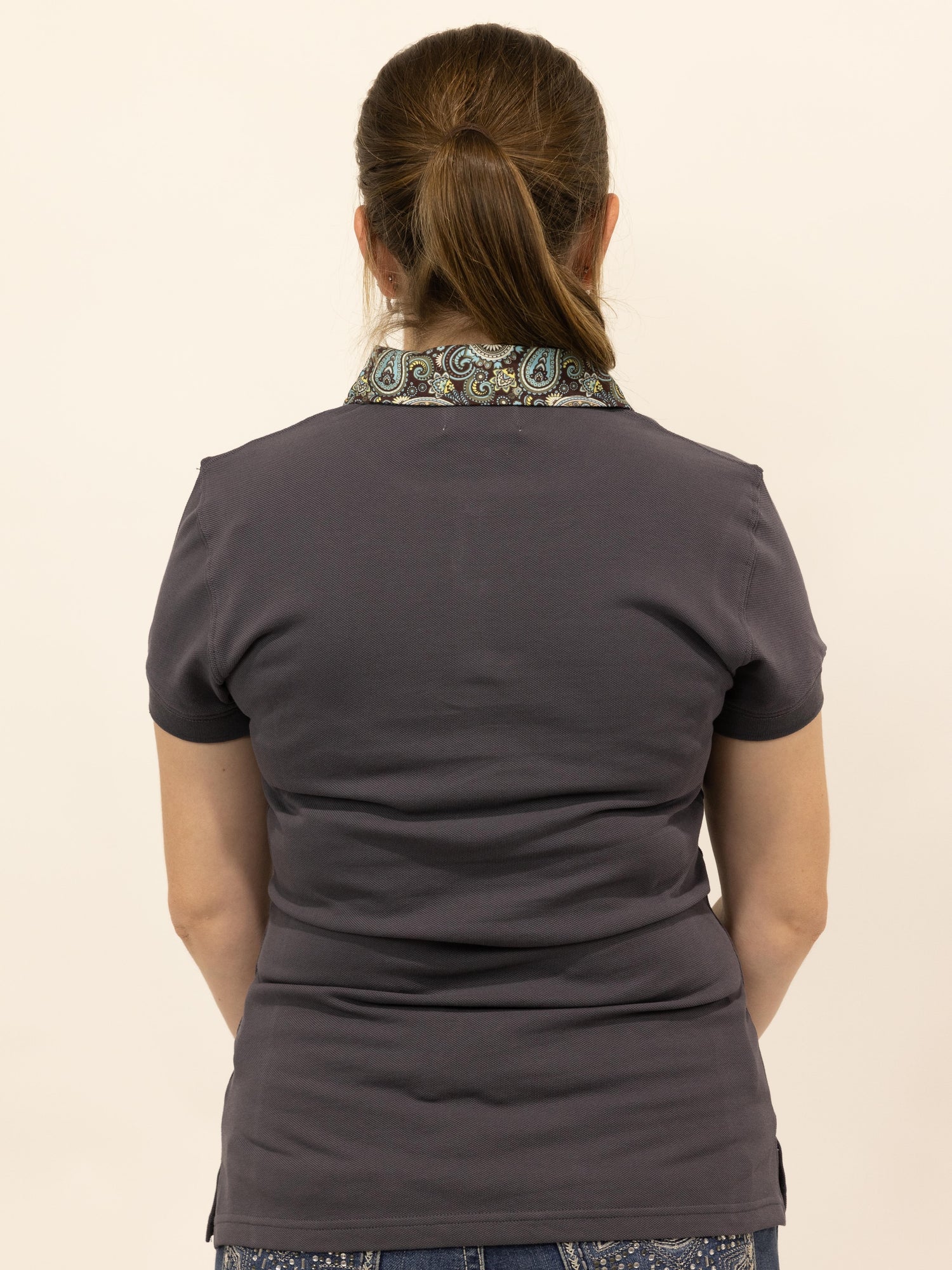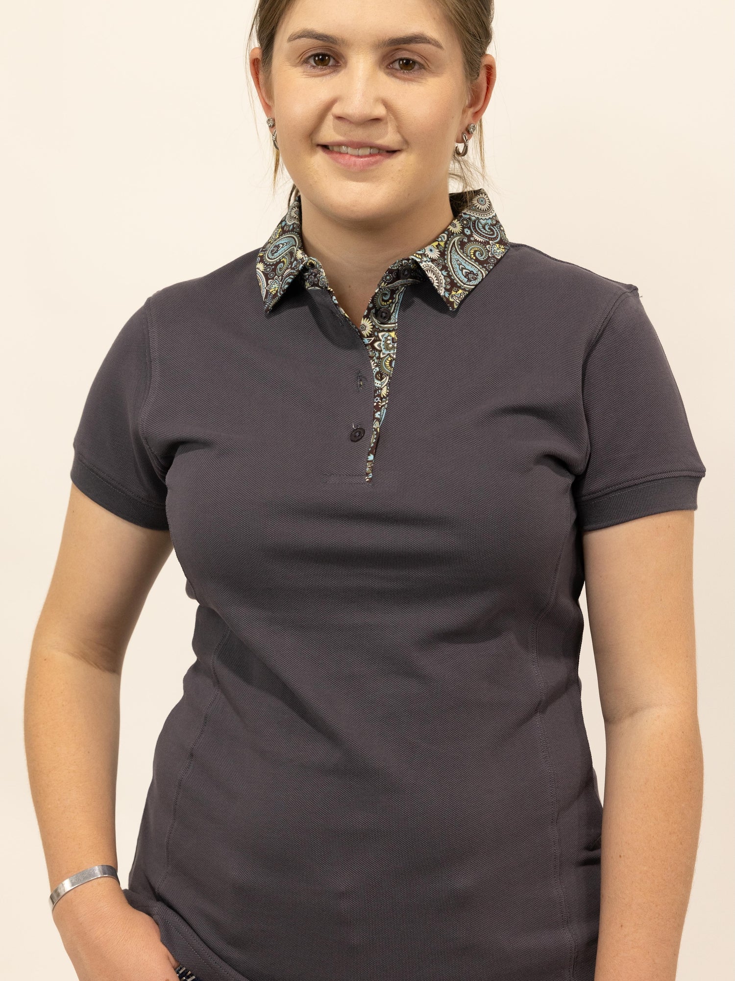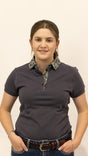 Clancy - Charcoal with paisley trim Polo Shirt - Ladies 8 is backordered and will ship as soon as it is back in stock.