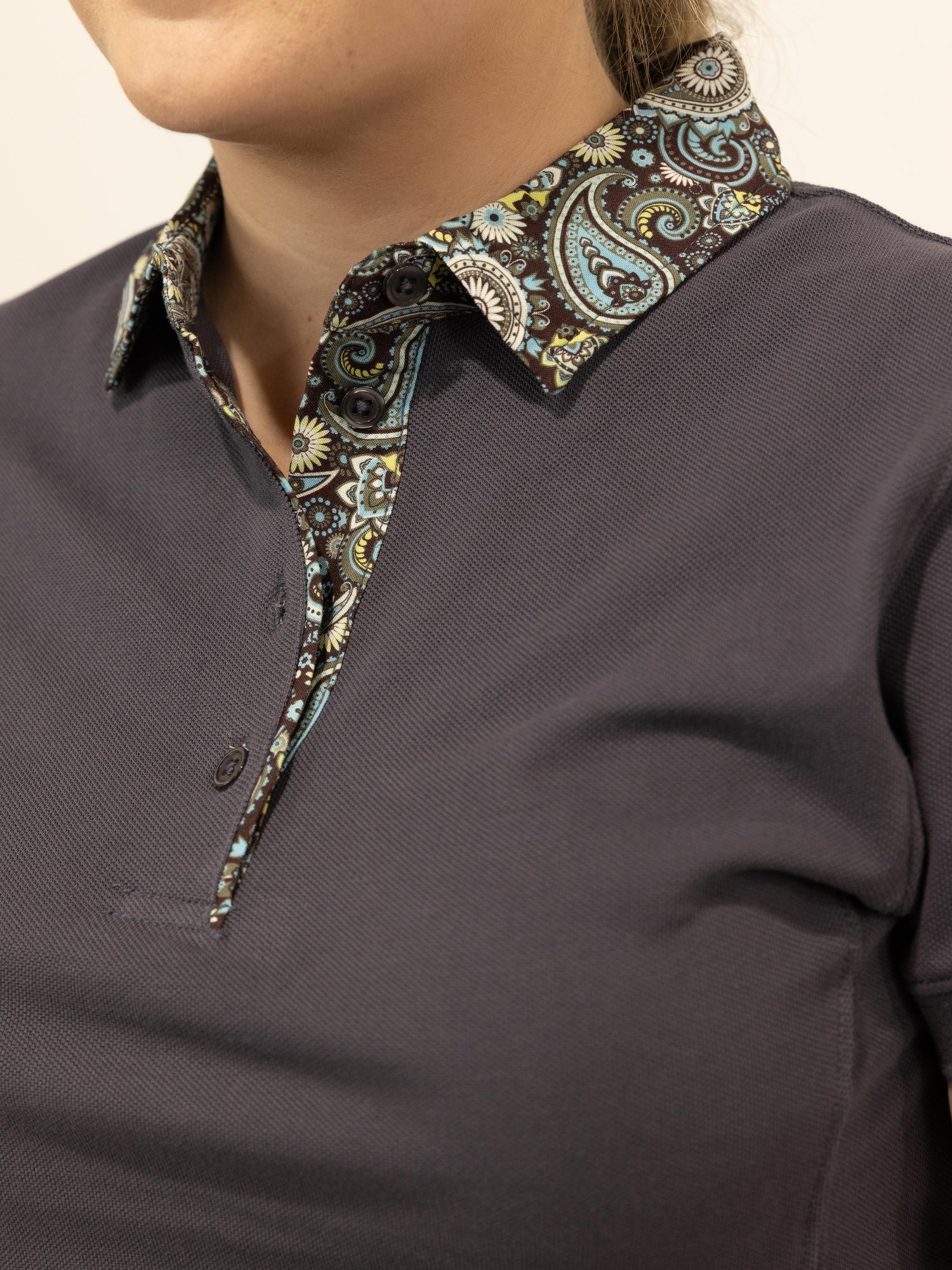 Clancy is a lovely charcoal grey shade, short sleeve polo with contrasting detail of paisley pattern on the collar and placket opening. Buttons and colour matched grey.