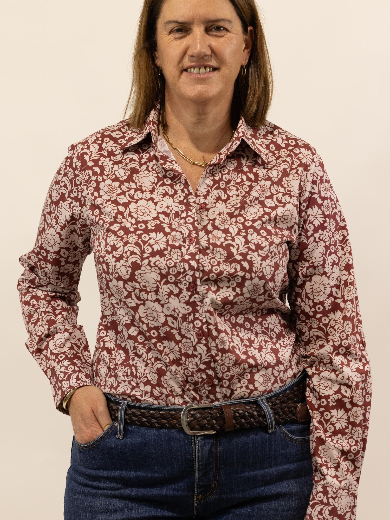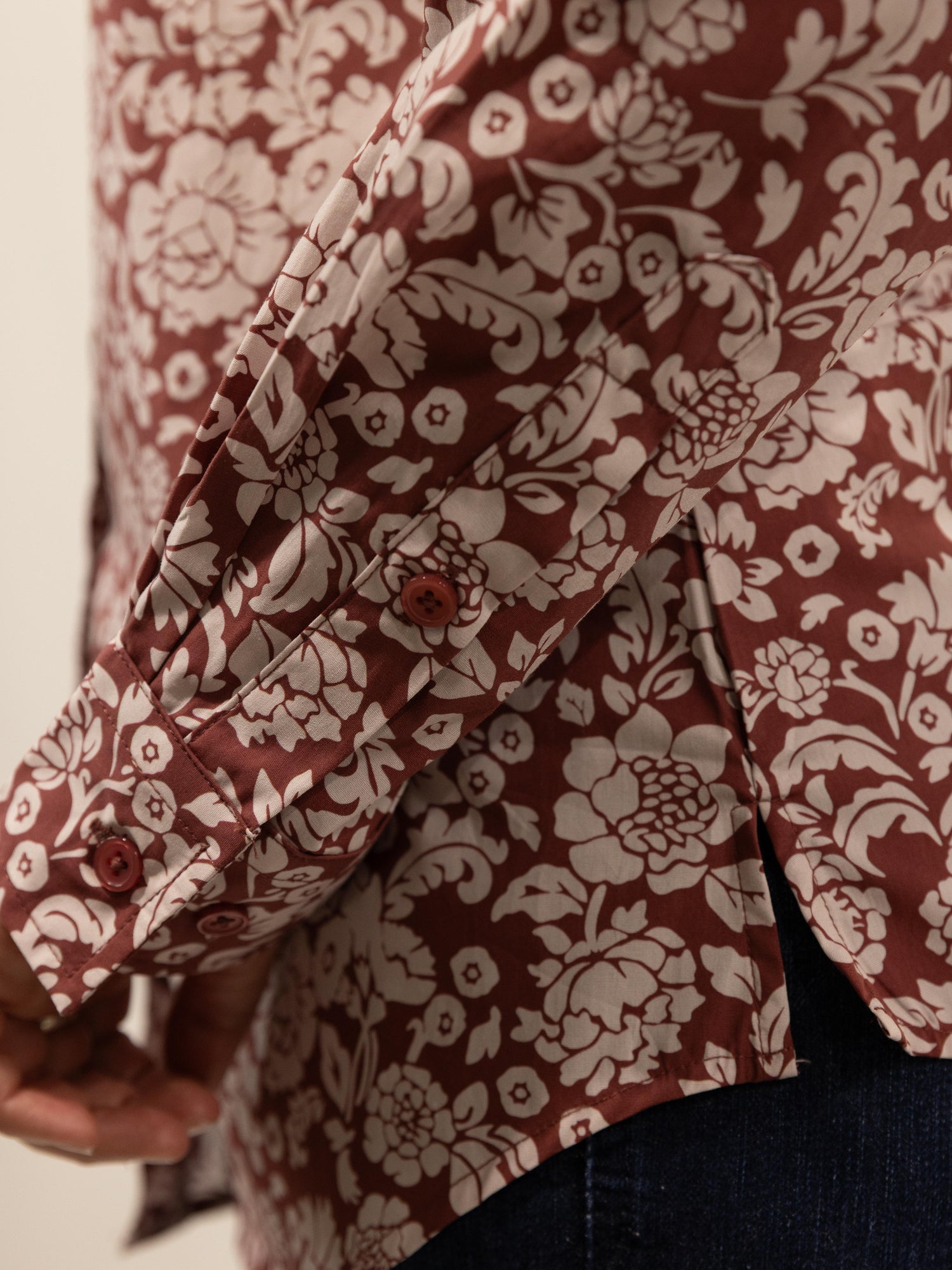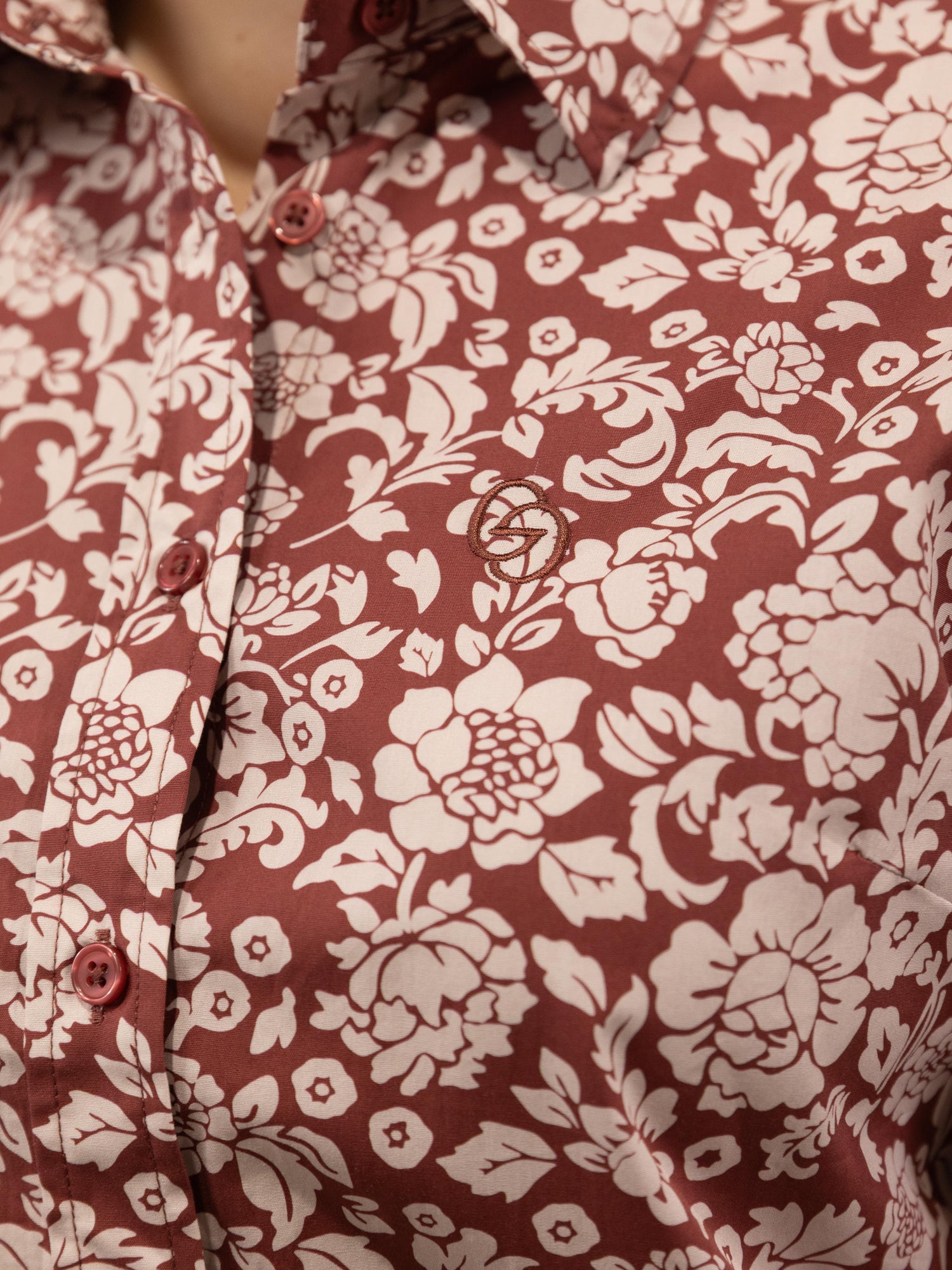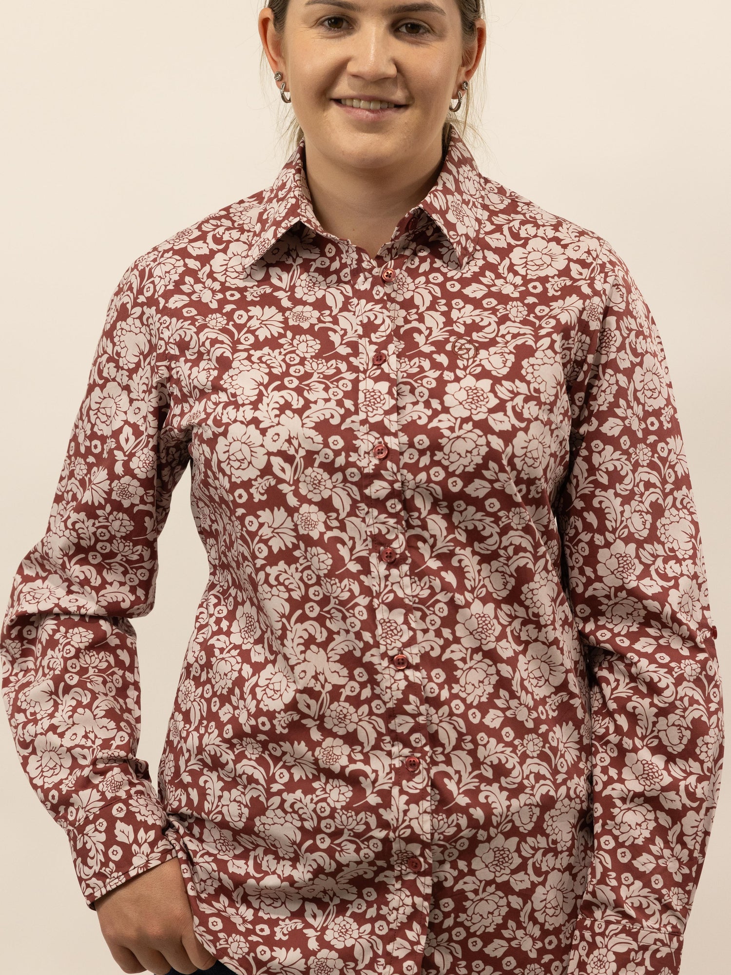 This gorgeous shirt has a rusty terrecotta background with an off white floral pattern. Made from quality lightweight cotton featuring a full length front placket, roll up sleeve with button and tab, standable collar and the buttons are colour matched rusty terracotta.
