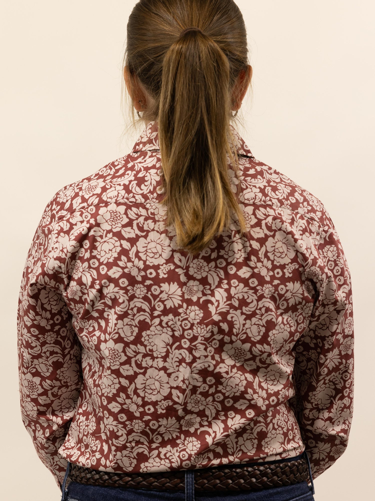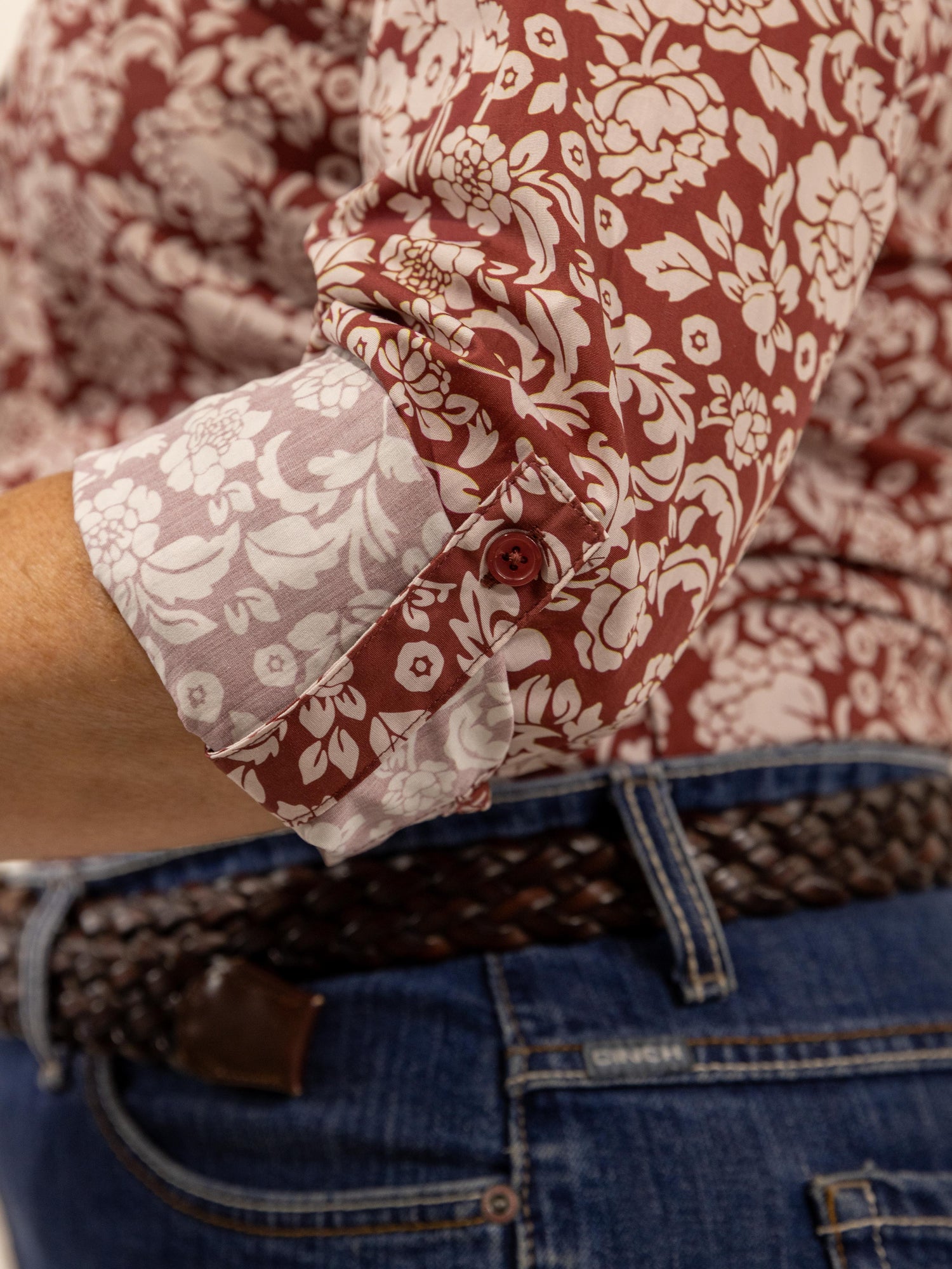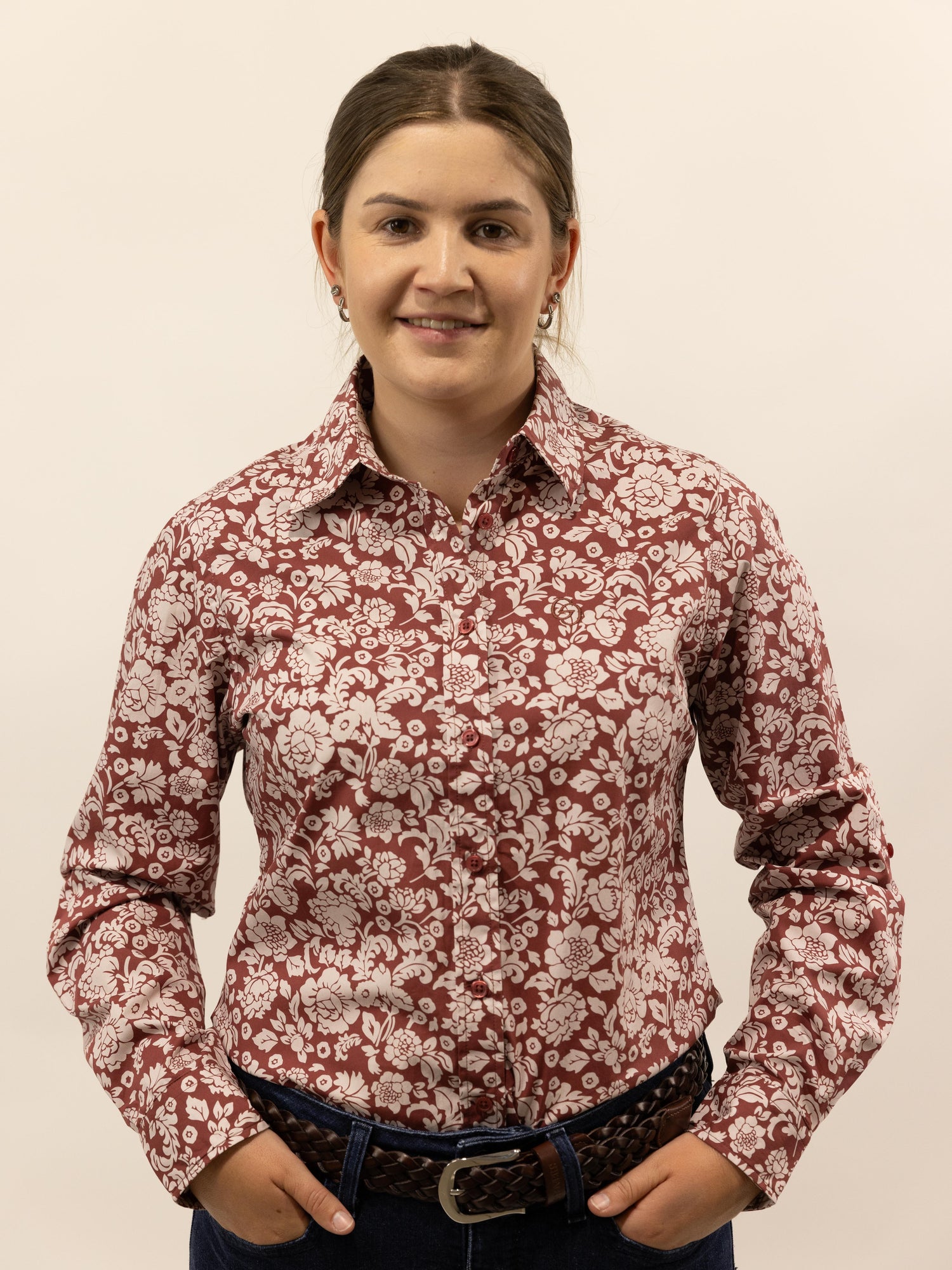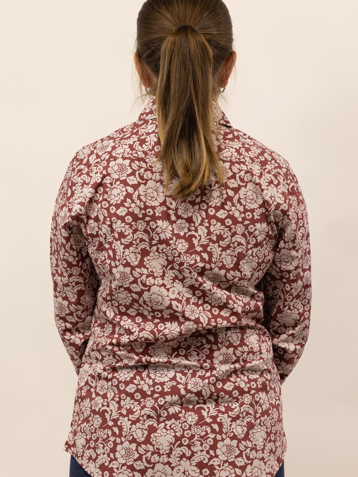 This gorgeous shirt has a rusty terrecotta background with an off white floral pattern. Made from quality lightweight cotton featuring a full length front placket, roll up sleeve with button and tab, standable collar and the buttons are colour matched rusty terracotta.