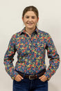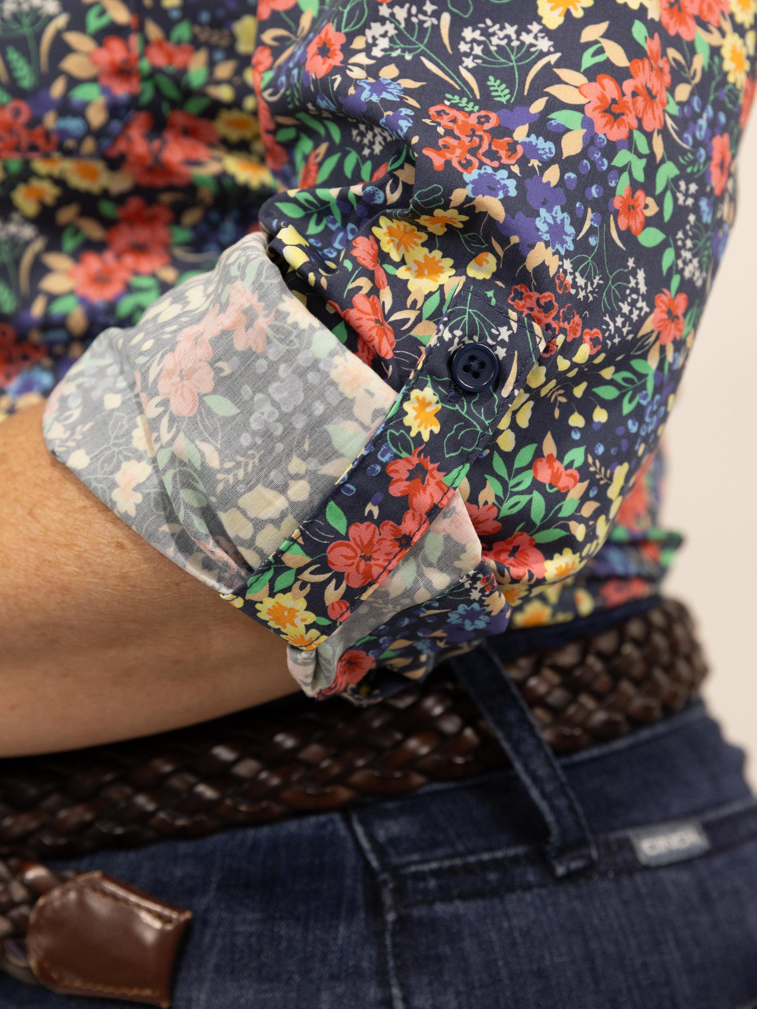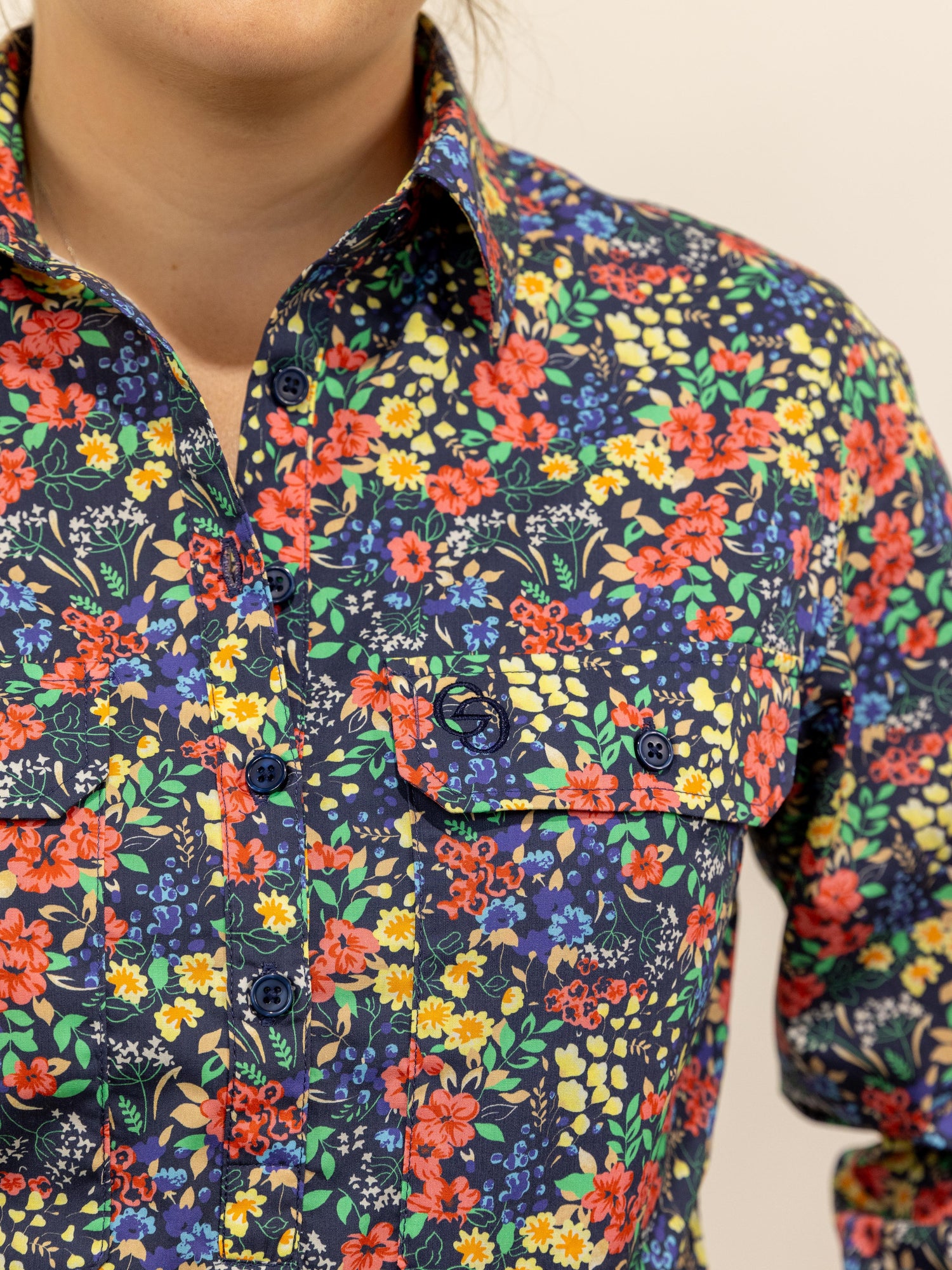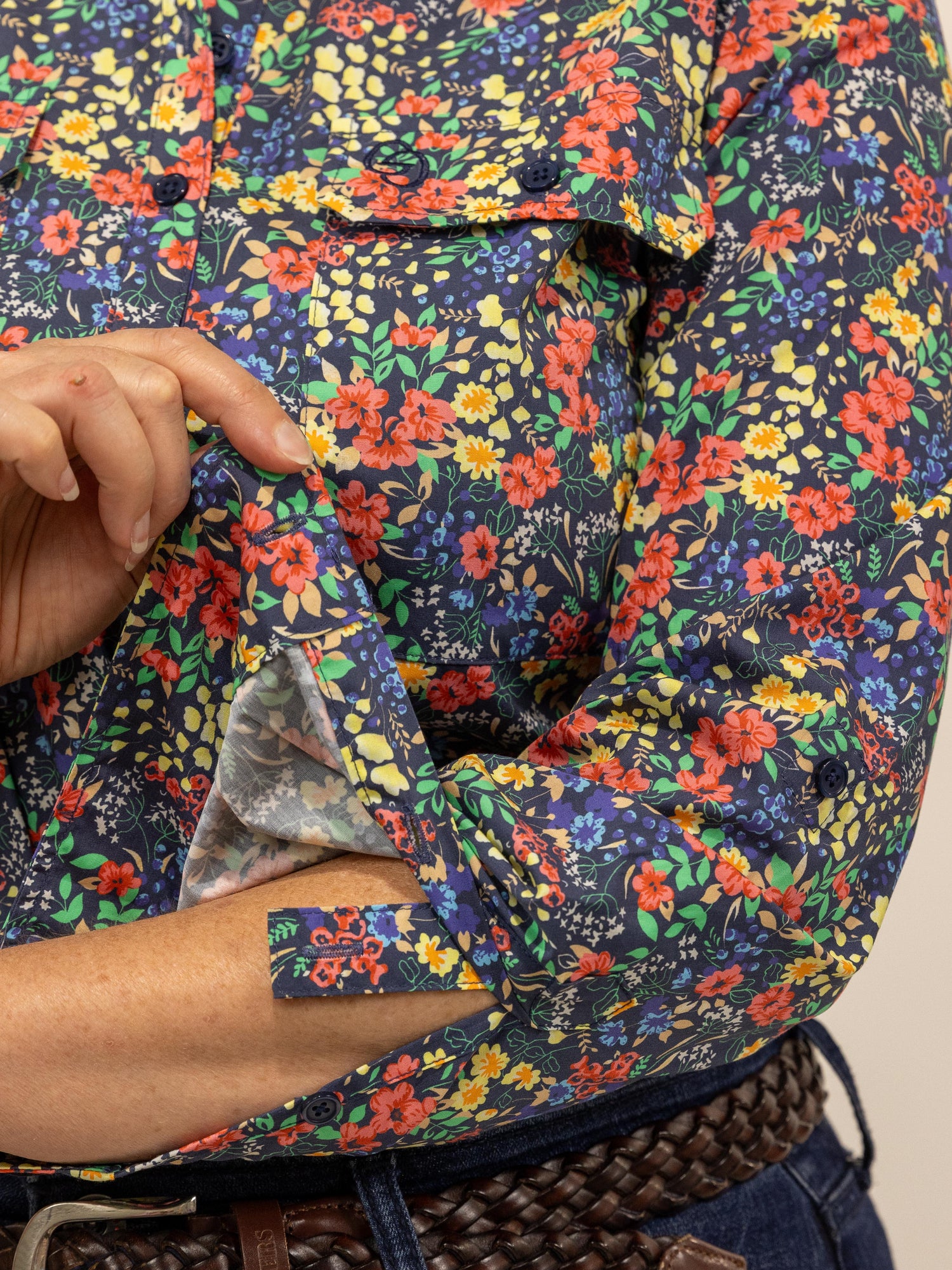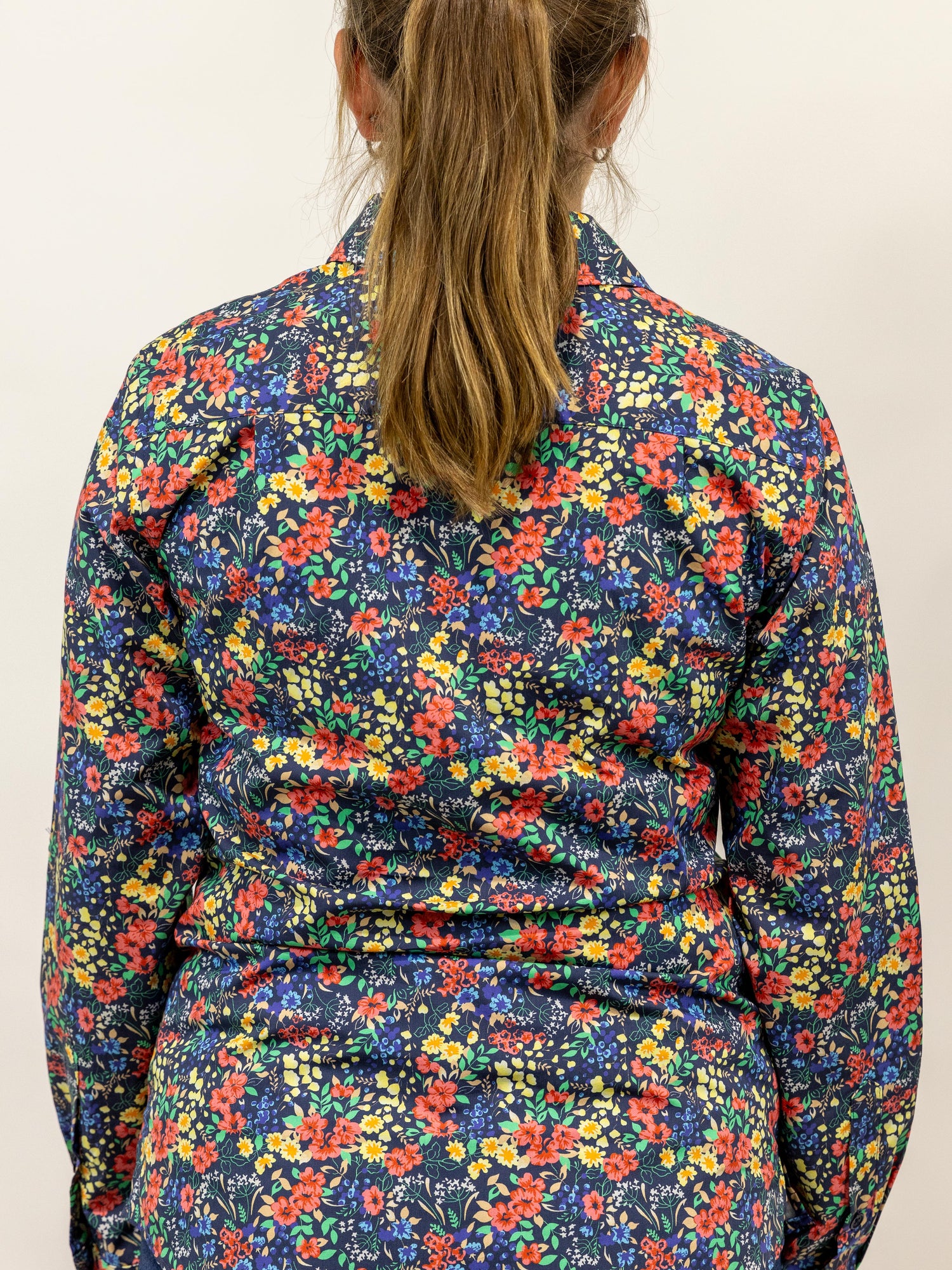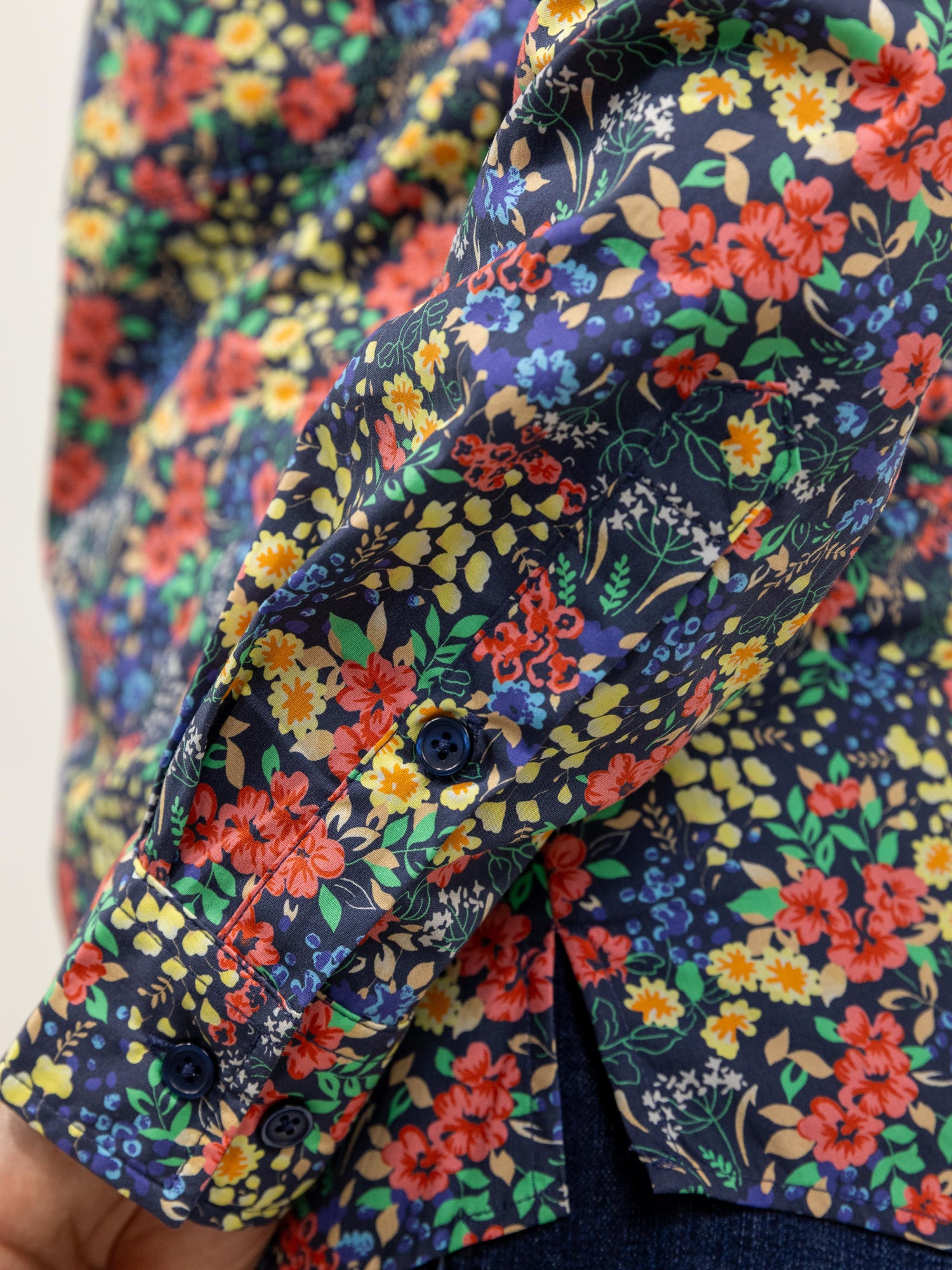 This is a gorgeous shirt with all over red/yellow/blue floral pattern with greenery set on a dark navy background. Made from quality lightweight cotton fabric with buttons that are a colour matched navy.