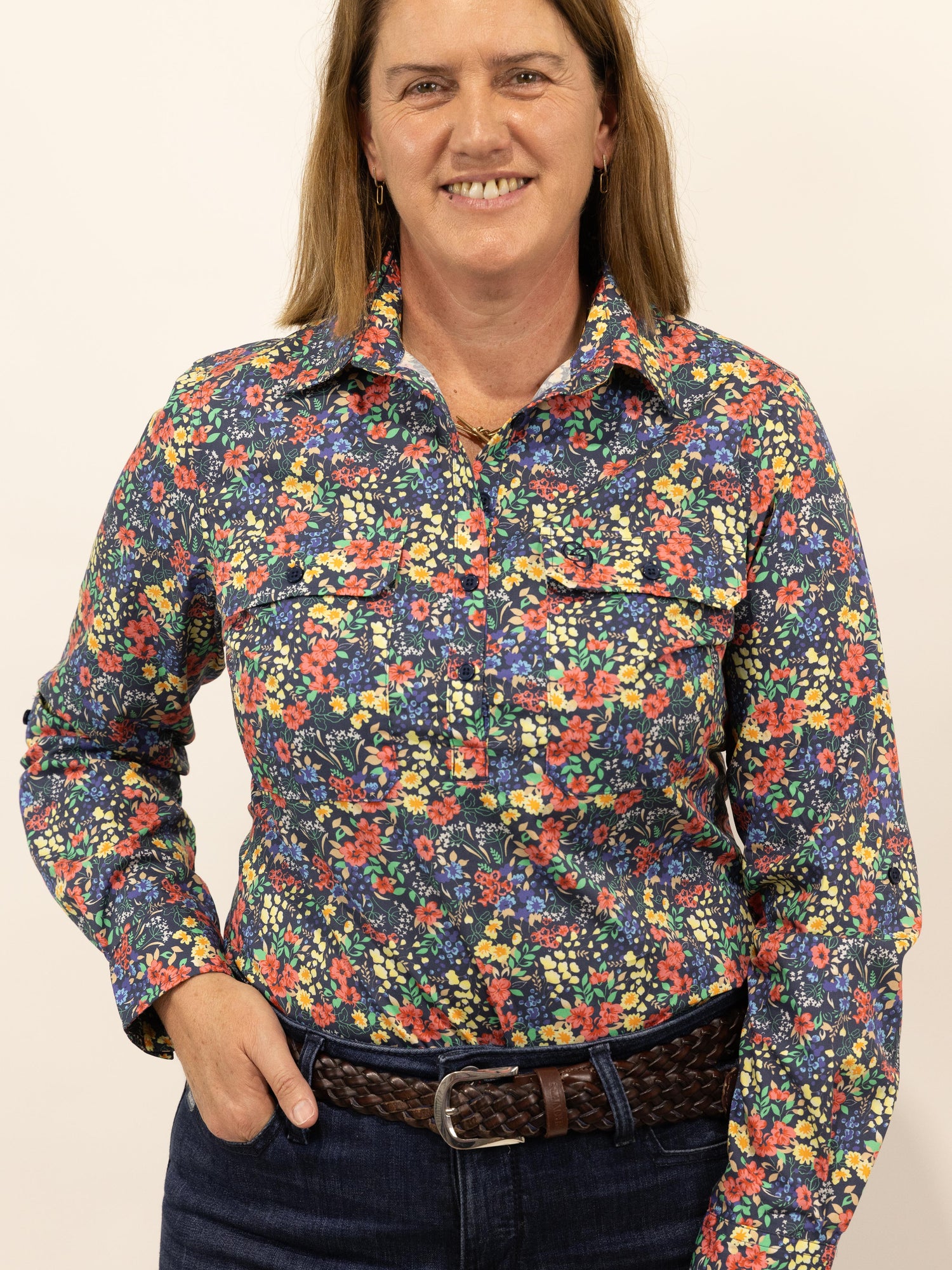 Features - pockets to fit your phone (13x18cm), longer front placket for ease over the head, yoke pleats for a little more room in the shoulders and side seam split for movement.