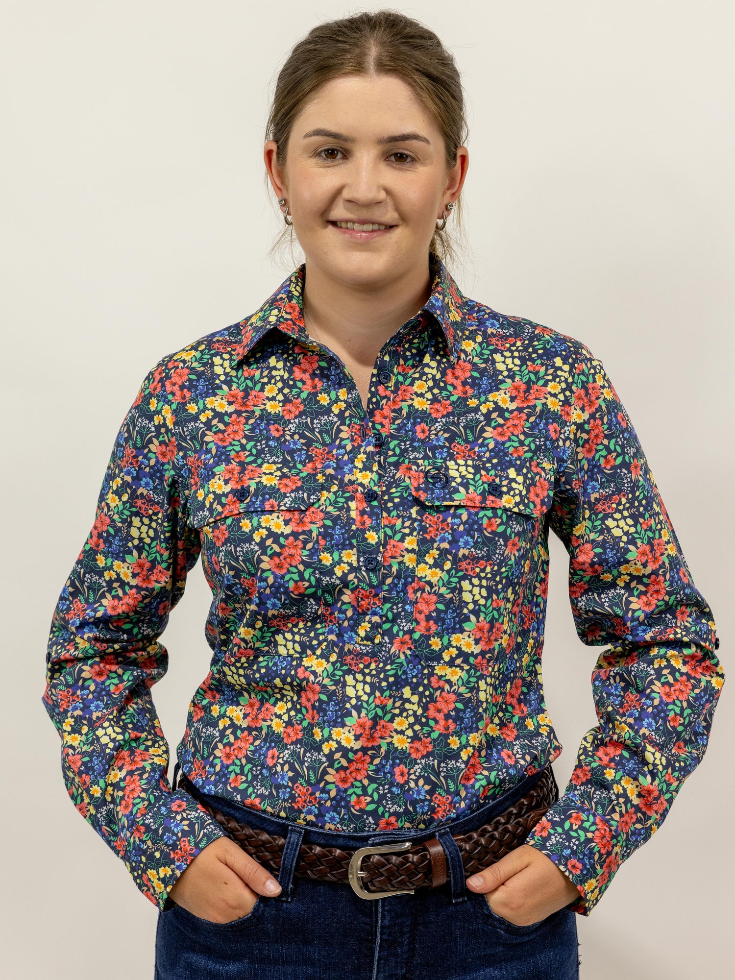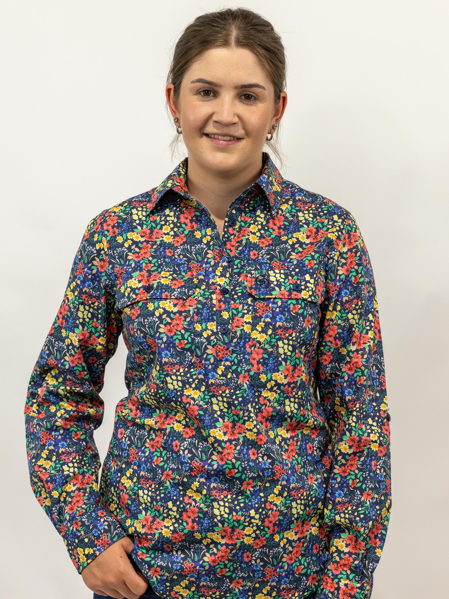 Judith - 1/2 Button Front Long Sleeve Cotton Collared Shirt