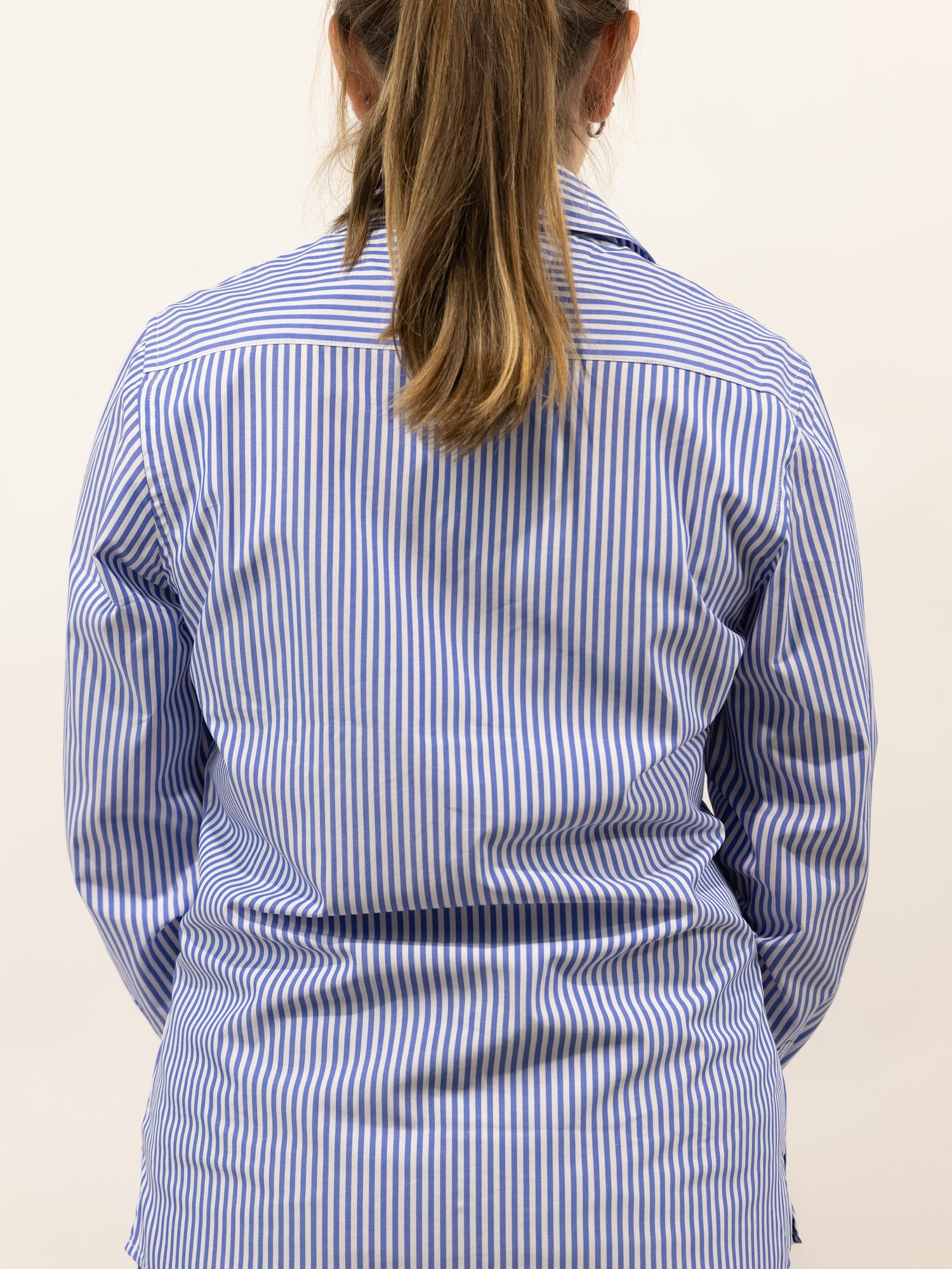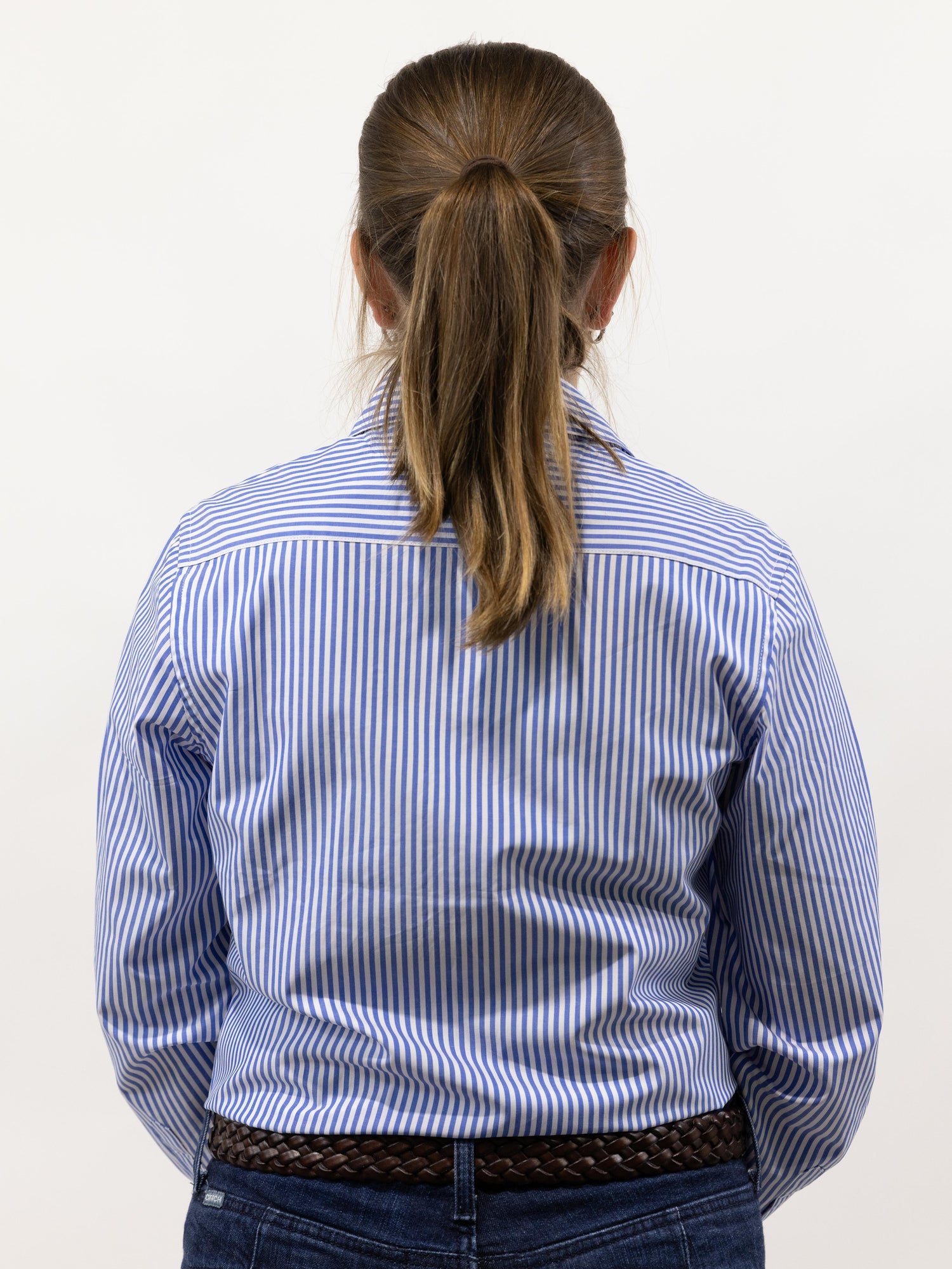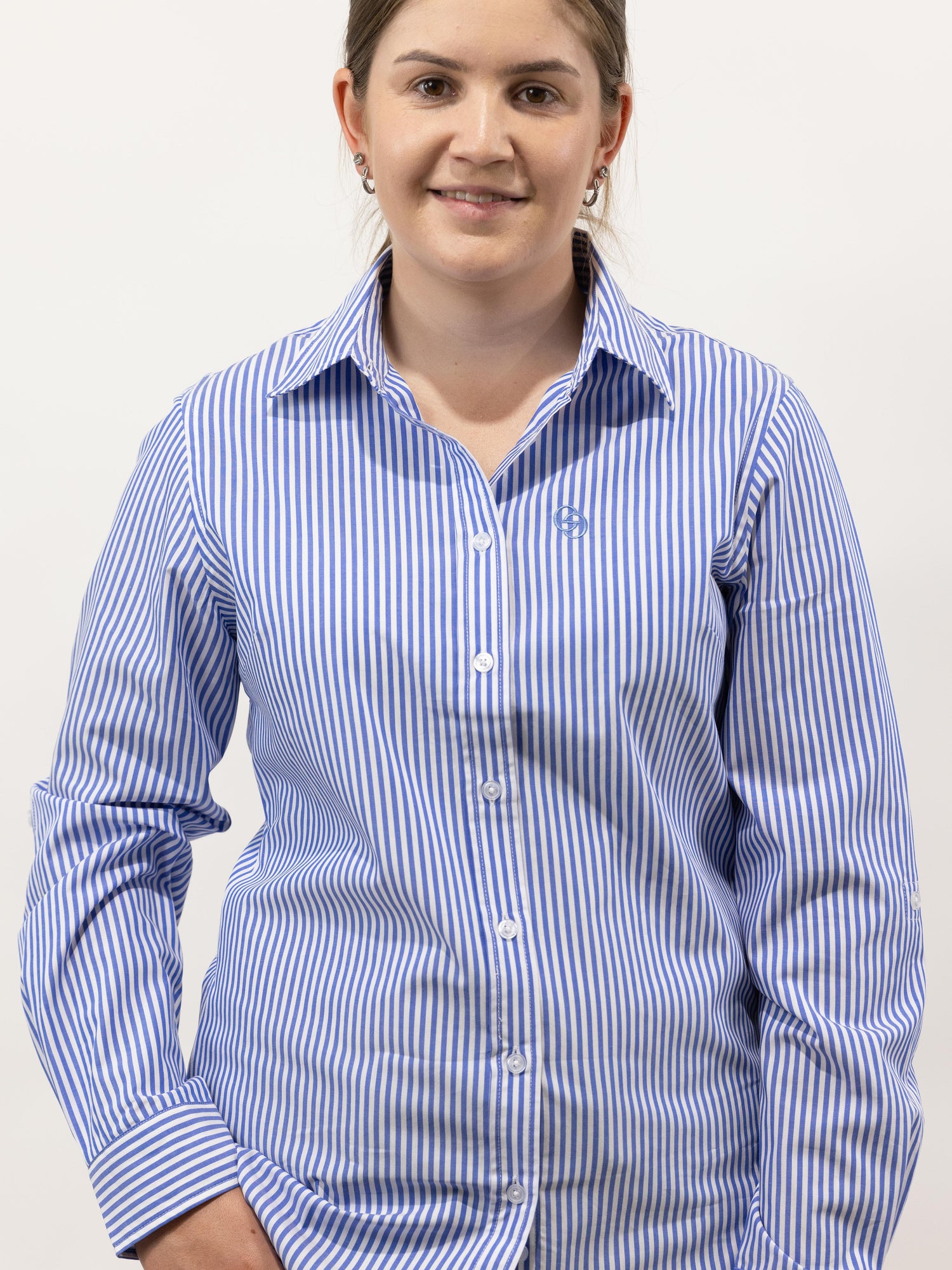 This gorgeous shirt is a classic blue and white striped shirt. Made from quality lightweight cotton featuring a full length front placket, roll up sleeve with button and tab, standable collar and the buttons are pearlised clear.