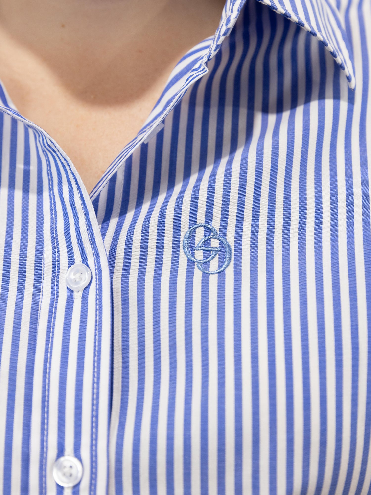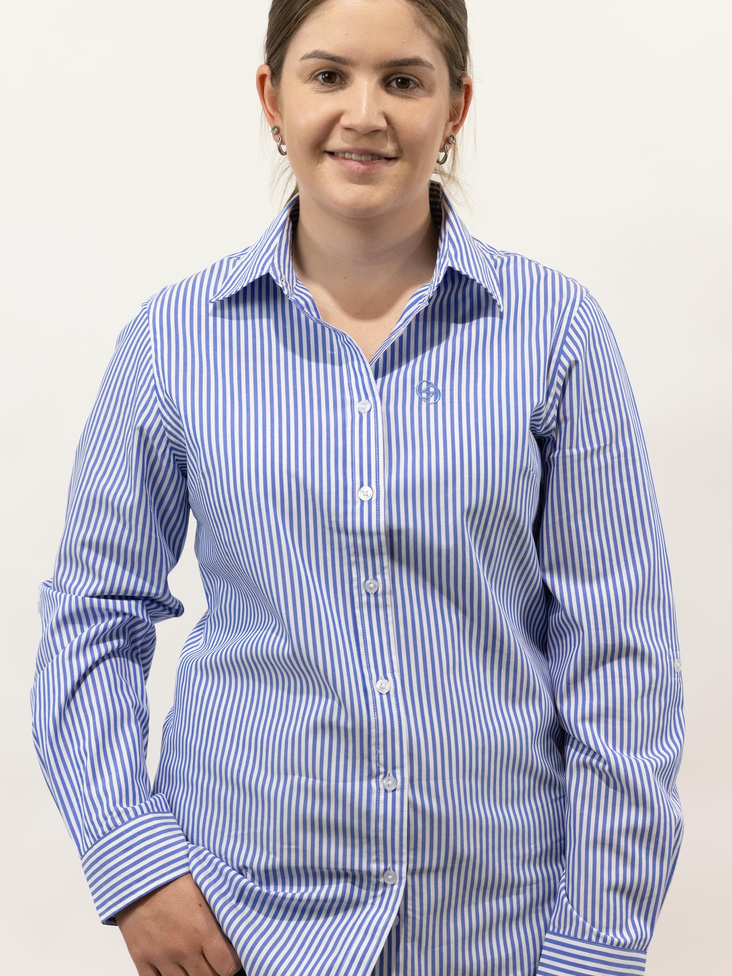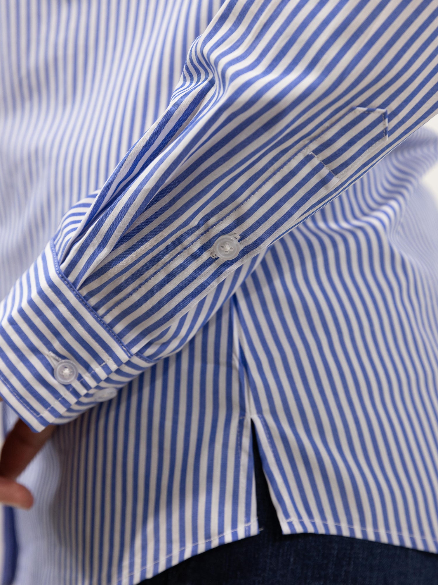 This gorgeous shirt is a classic blue and white striped shirt. Made from quality lightweight cotton featuring a full length front placket, roll up sleeve with button and tab, standable collar and the buttons are pearlised clear.