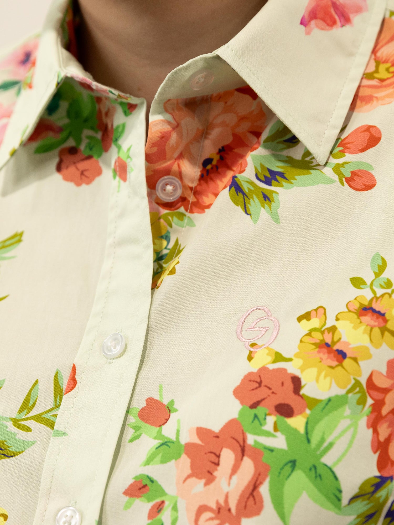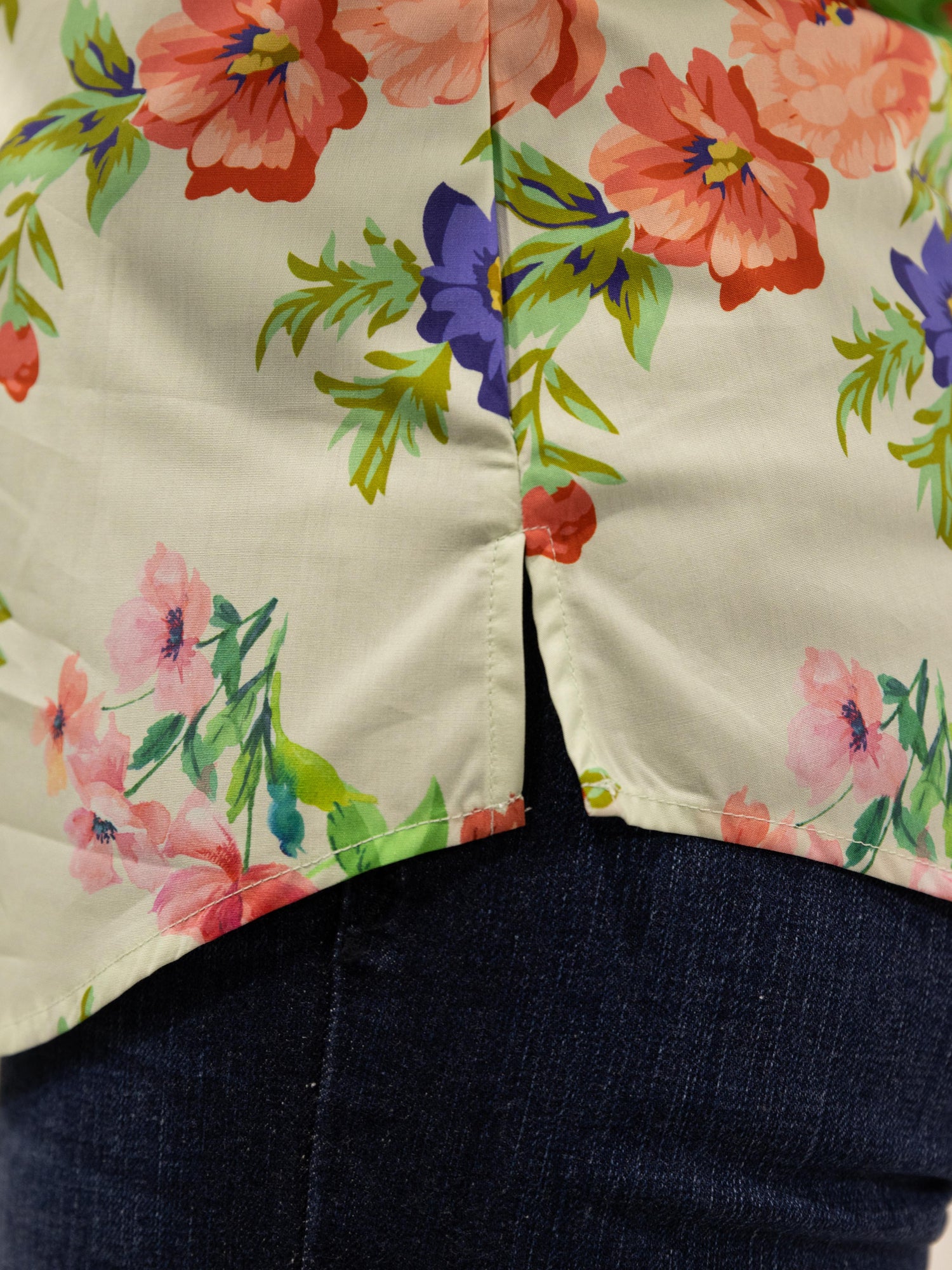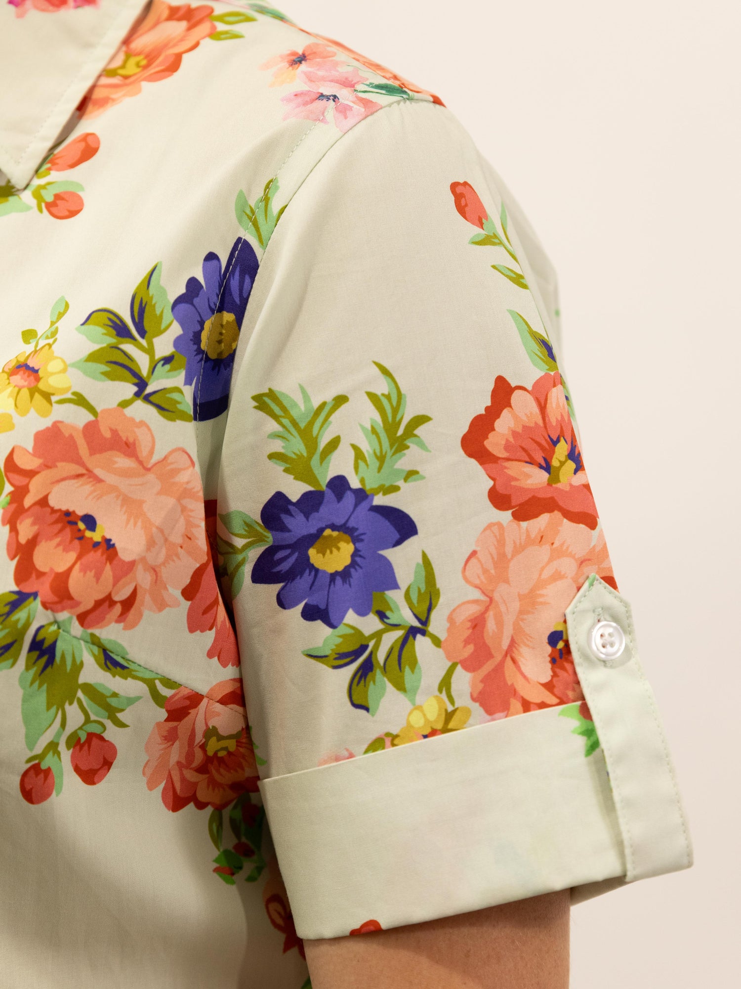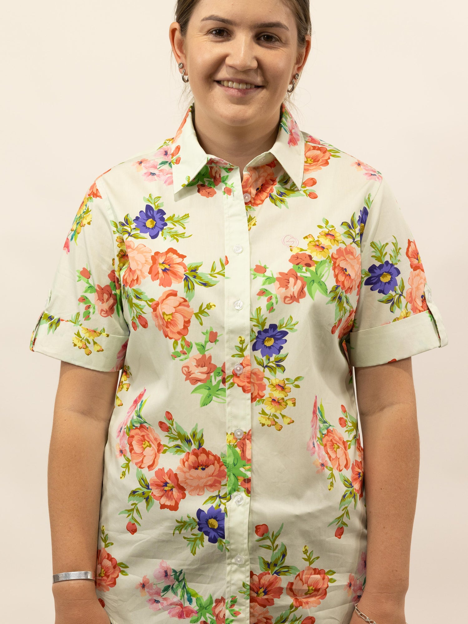 Such a pretty colourful floral pattern on a light mint background, it is made from a quality lightweight cotton and the buttons are pearlised clear.