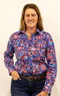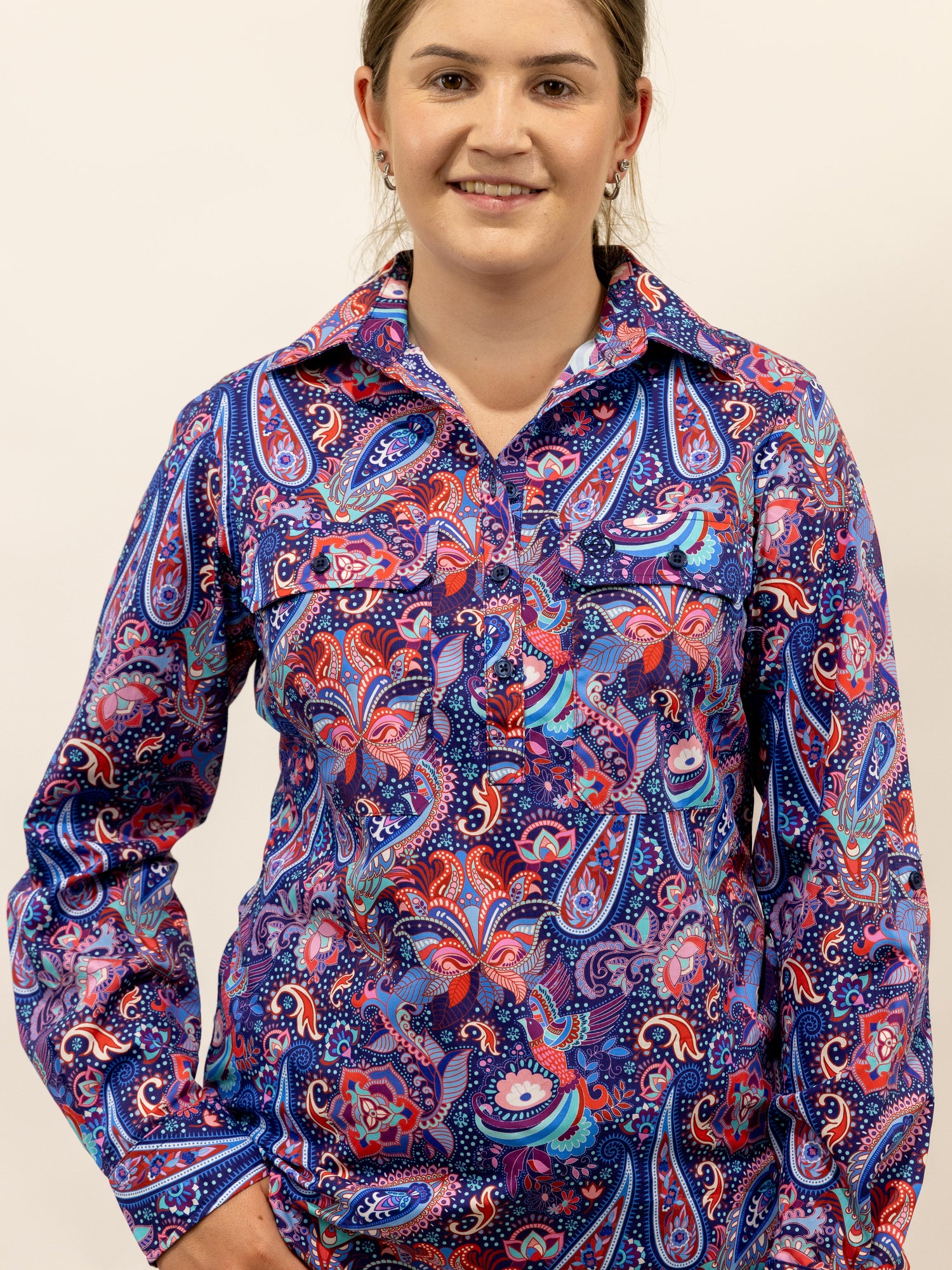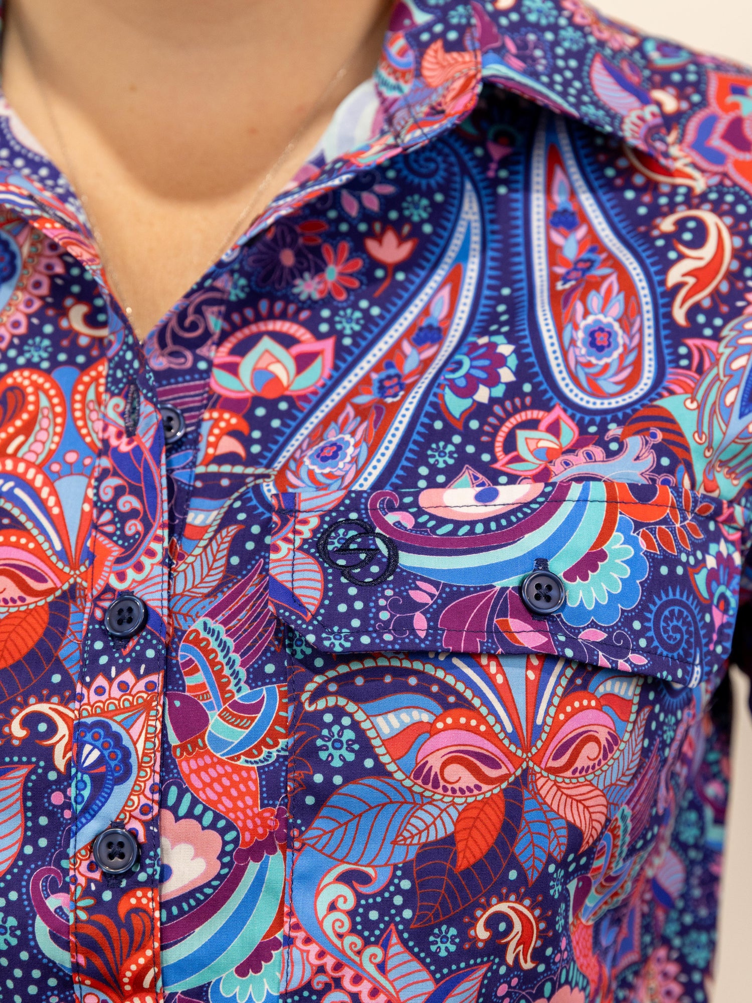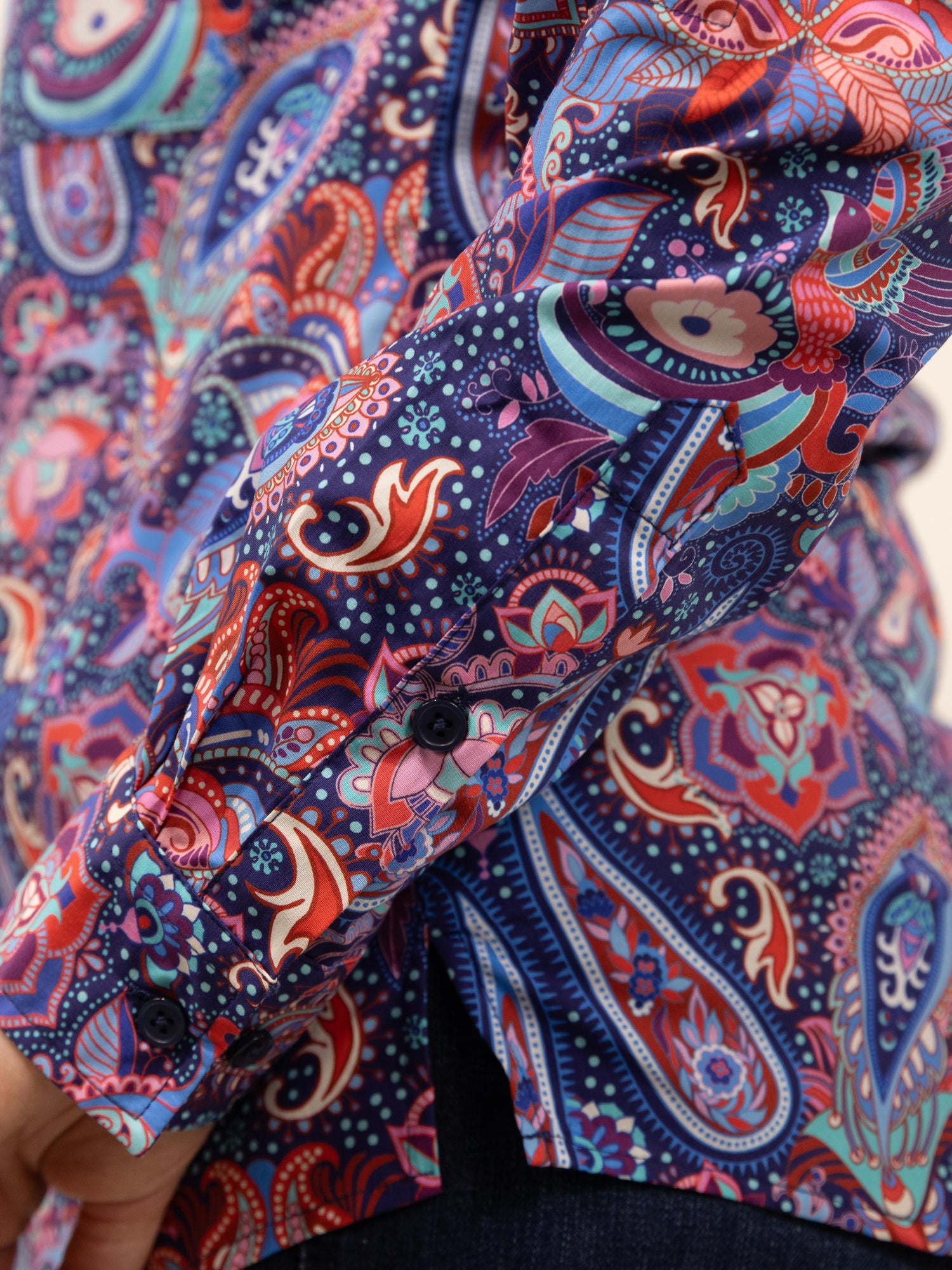 This is a gorgeous shirt with a bright and colourful paisley pattern set on a dark blue background. Made from quality lightweight cotton fabric with buttons that are a colour matched dark blue.