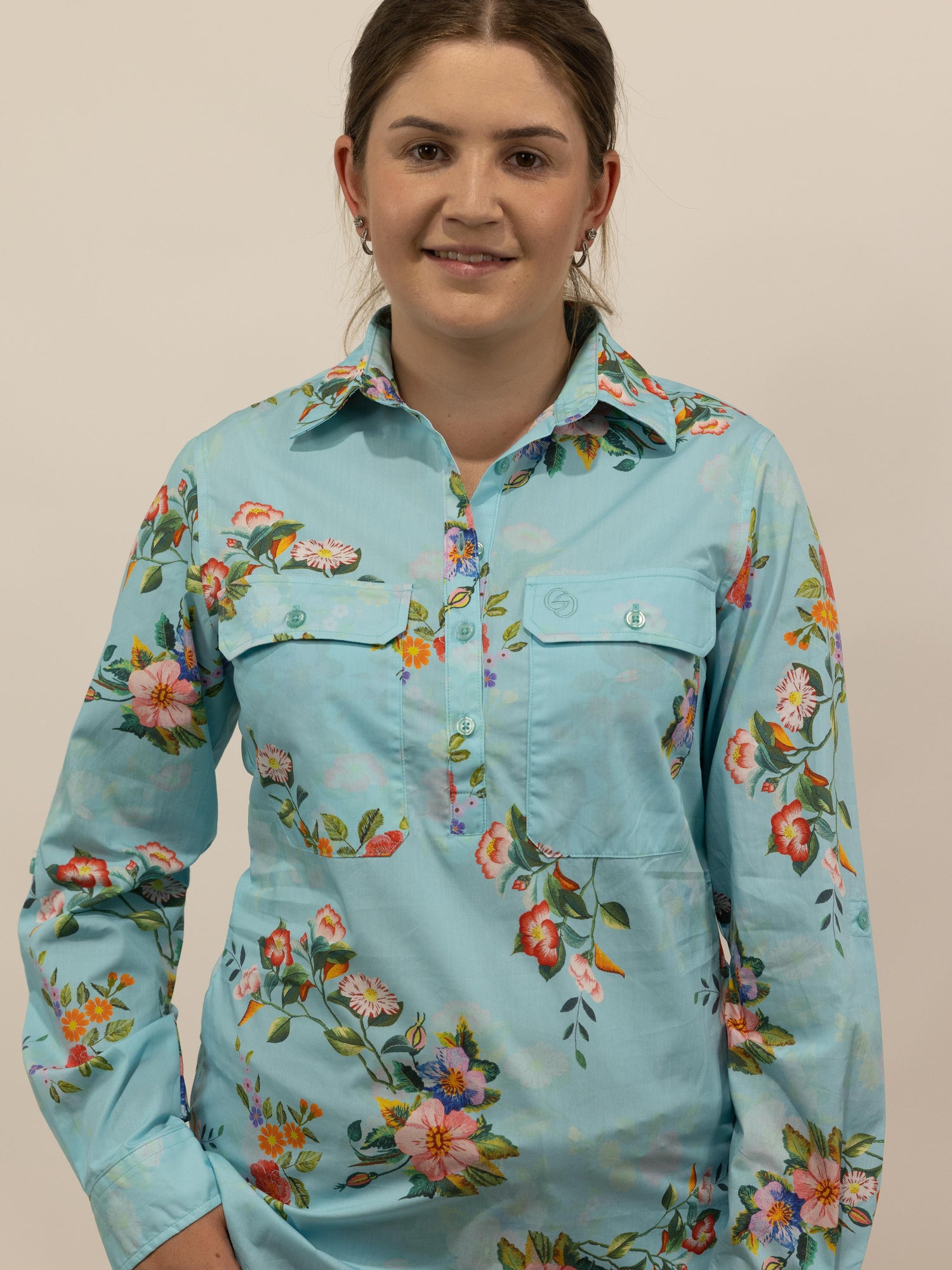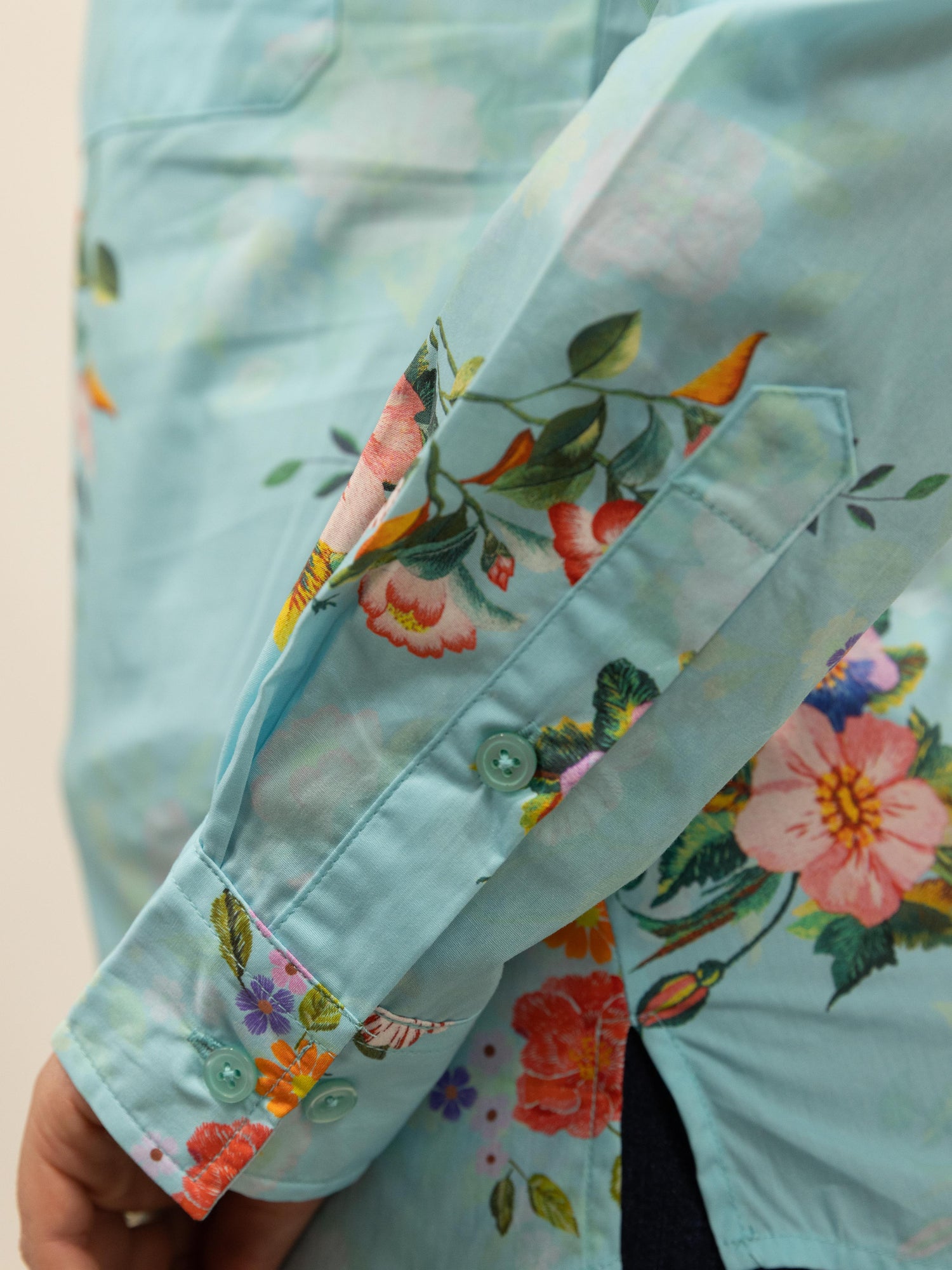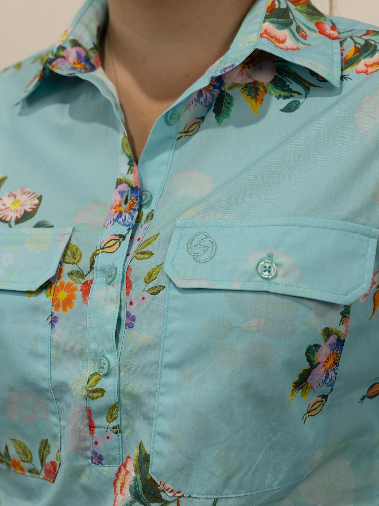This is a gorgeous shirt with a colourful floral pattern, set on a solid soft teal colour with a soft shadow-like floral pattern throughout the background. Made from quality lightweight cotton fabric with buttons that are a colour matched light blue.