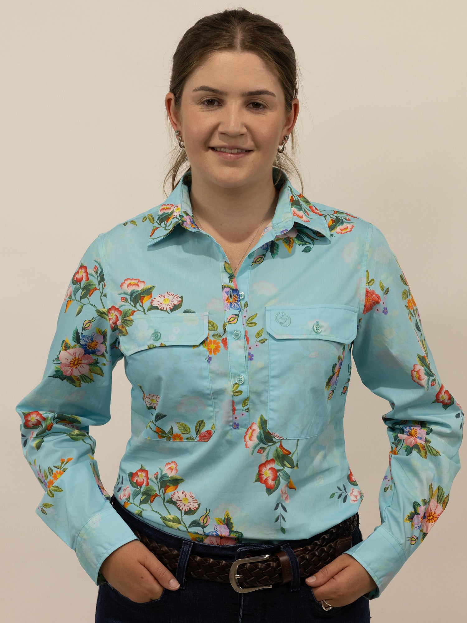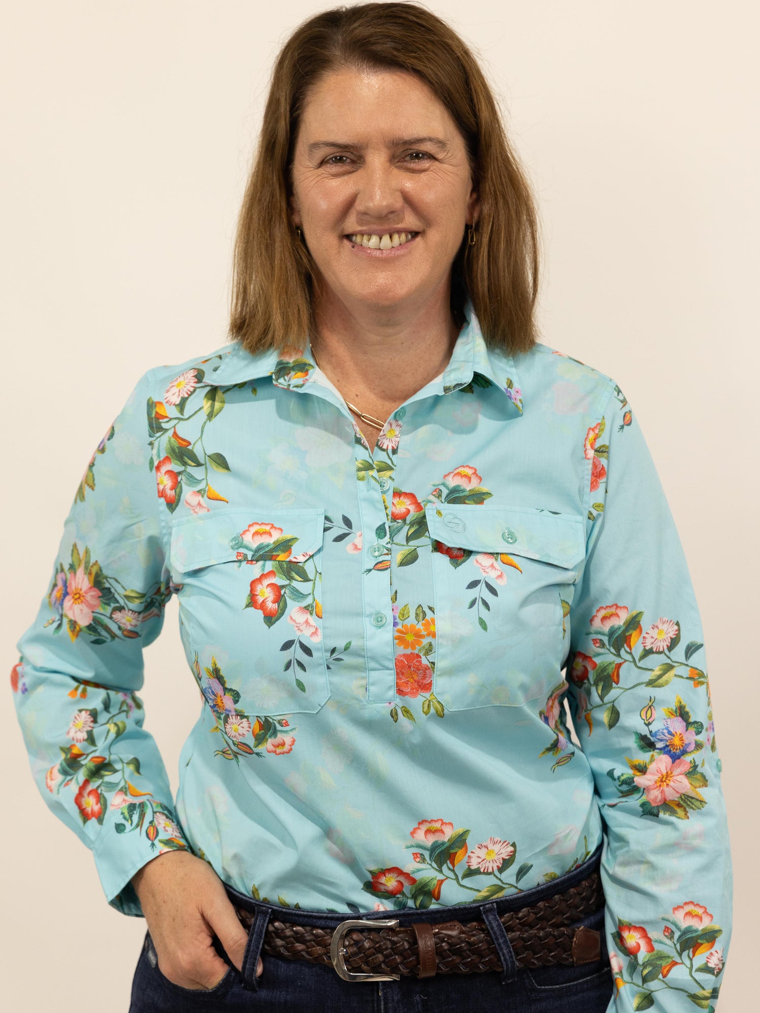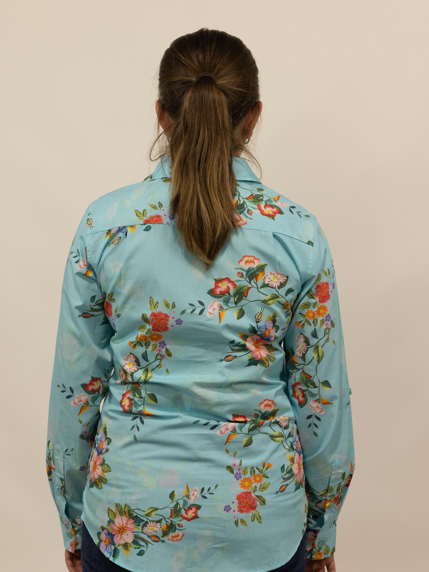 This is a gorgeous shirt with a colourful floral pattern, set on a solid soft teal colour with a soft shadow-like floral pattern throughout the background. Made from quality lightweight cotton fabric with buttons that are a colour matched light blue.