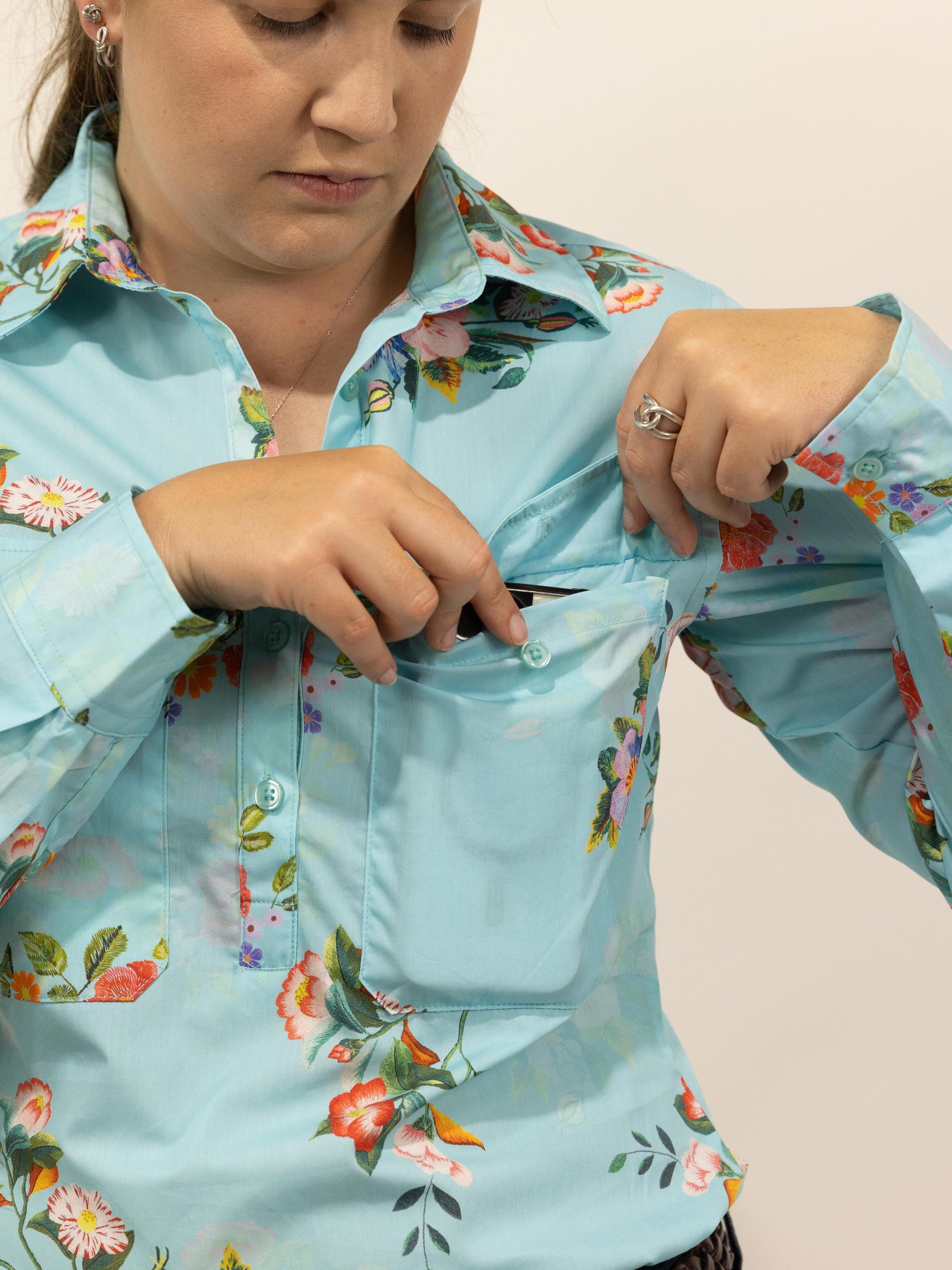 Features - pockets to fit your phone (13x18cm), longer front placket for ease over the head, yoke pleats for a little more room in the shoulders and side seam split for movement.