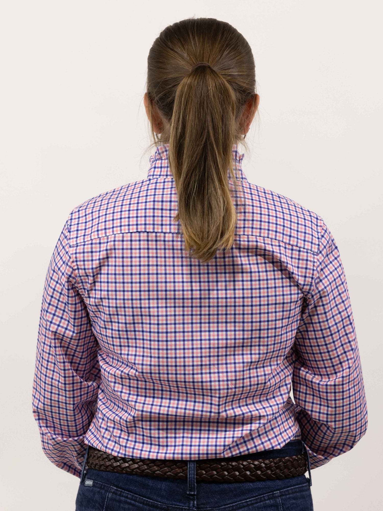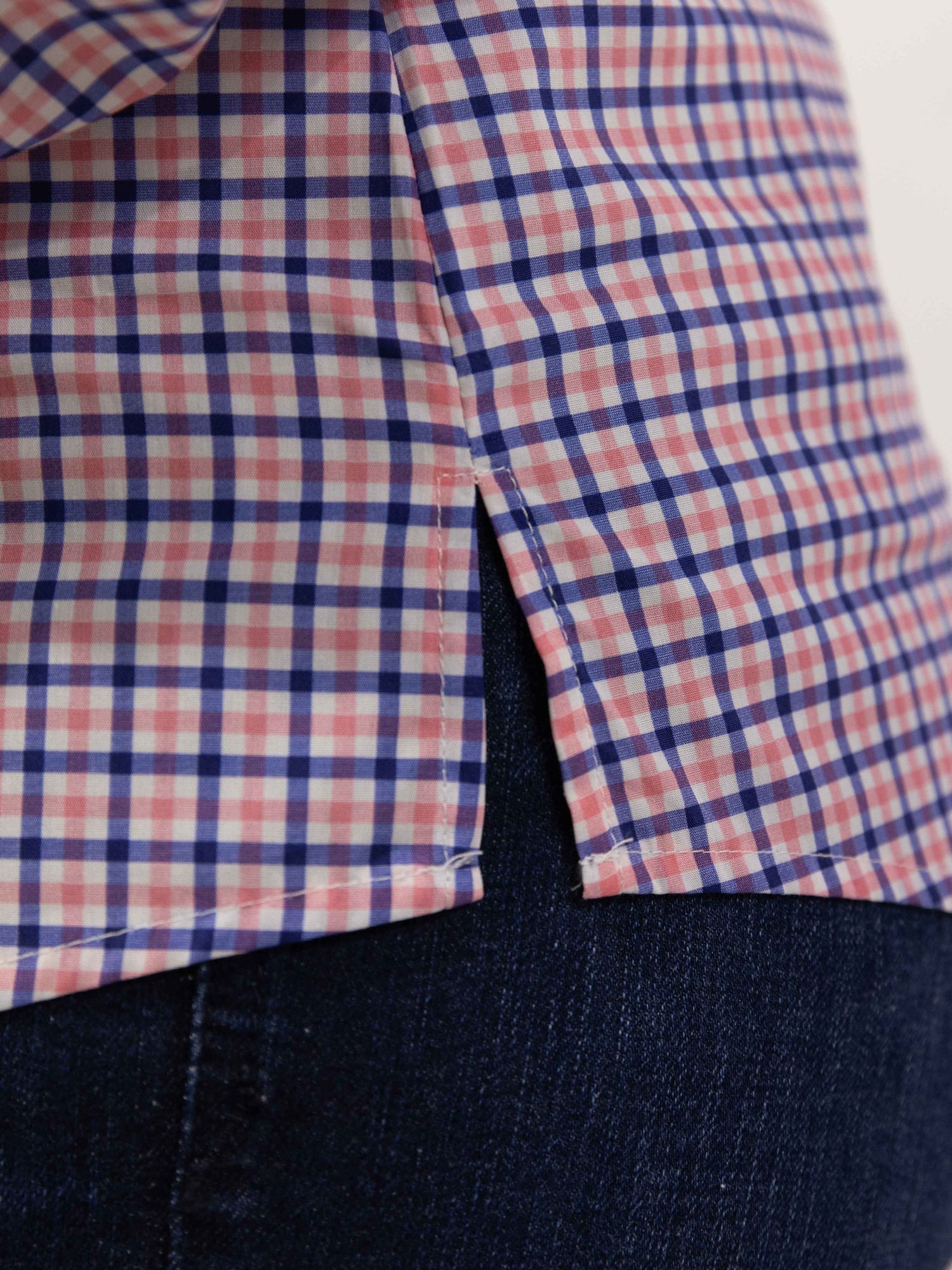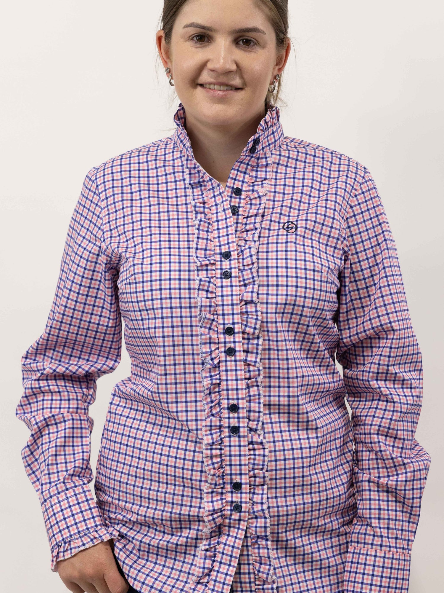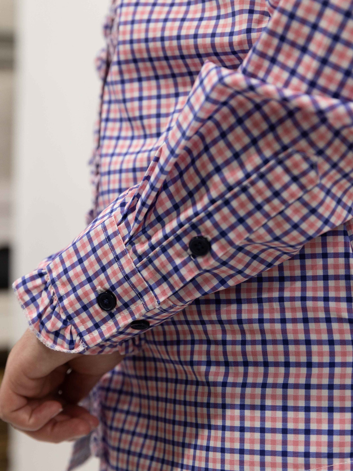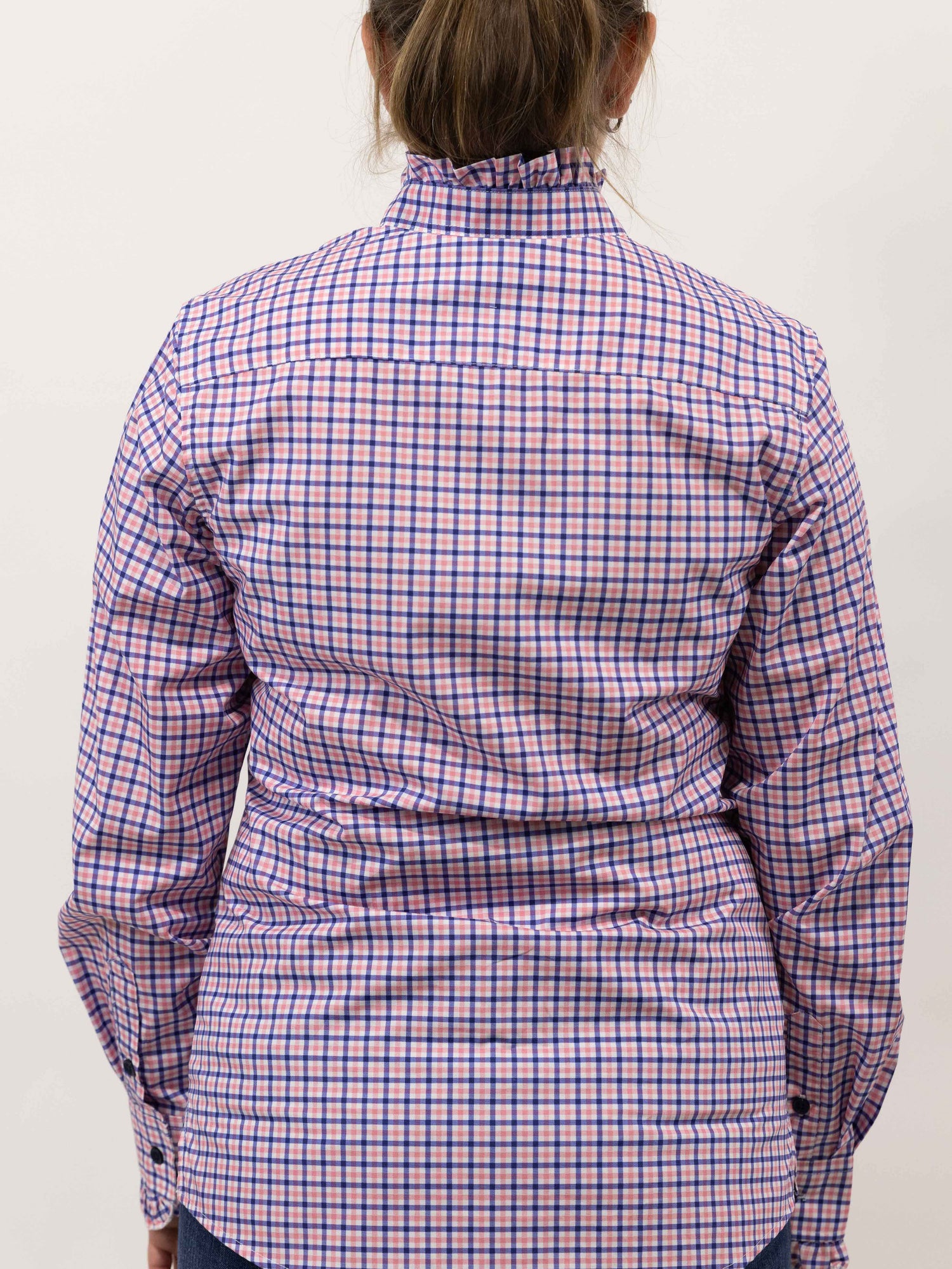 This is a classic navy, pink and white checked shirt with colour matched navy buttons. It is made from a quality lightweight cotton, featuring a ruffled collar, front and sleeve cuff with stylish double buttons on front placket. A stunning, classic and timeless shirt !