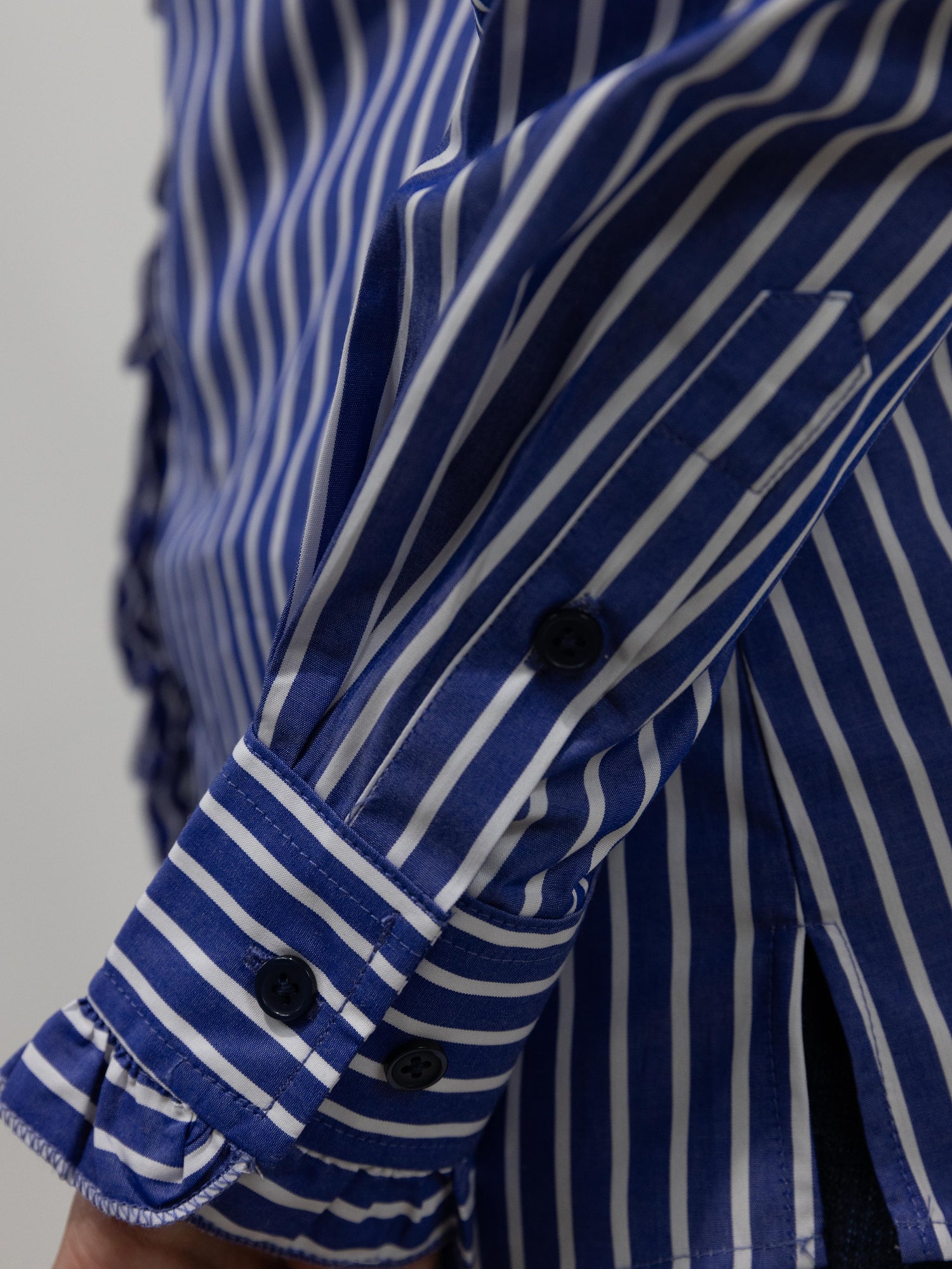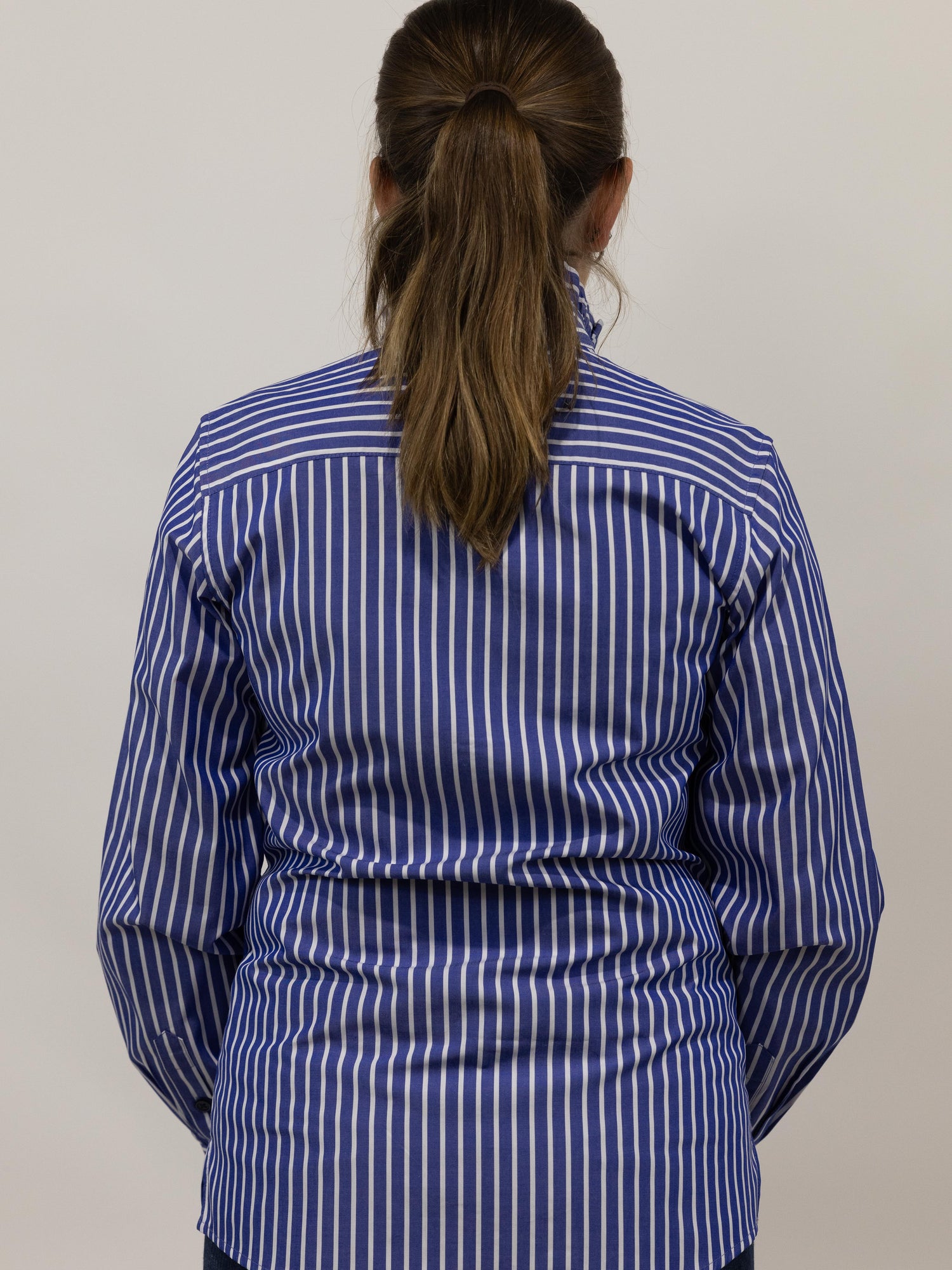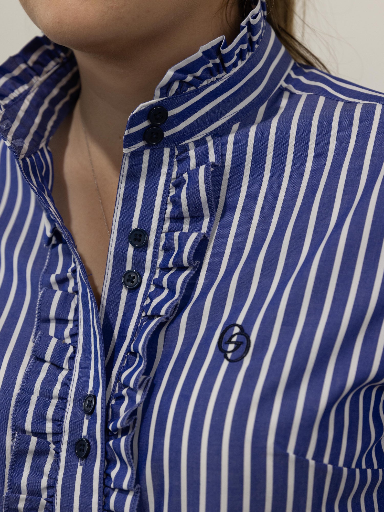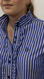 This classic stripe shirt is made from a quality lightweight cotton, featuring a ruffled collar, front and sleeve cuff with stylish double buttons on front placket. The buttons are a colour matched blue. A stunning, classic and timeless shirt !