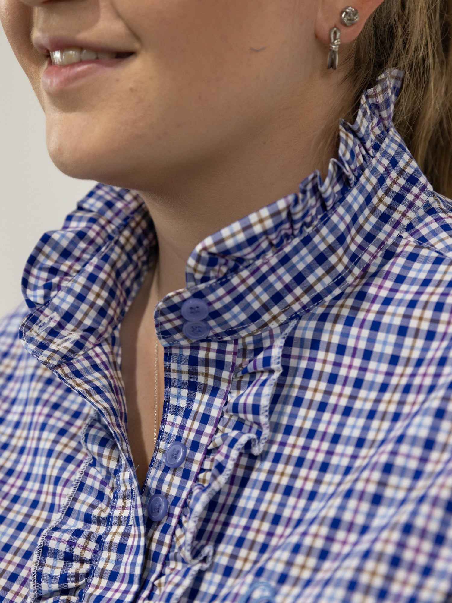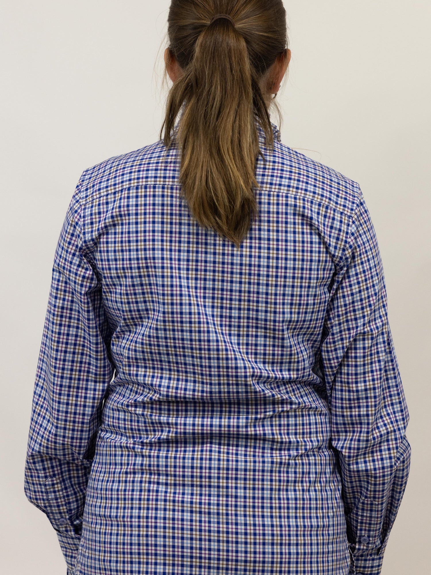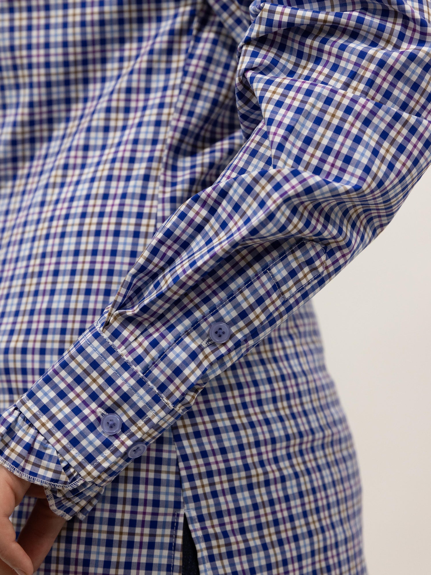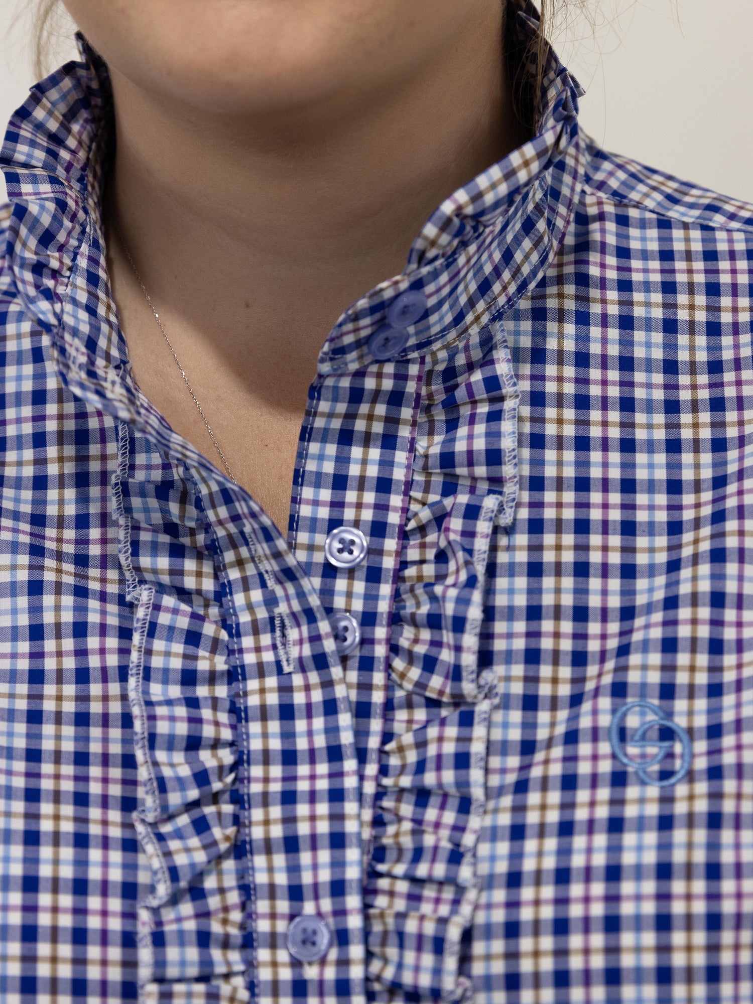 This stylish check shirt has a white background with a predominant navy blue check with a thin line of light blue, brown and purple check within, buttons are colour matched light blue. It is made from a quality lightweight cotton, featuring a ruffled collar, front and sleeve cuff with stylish double buttons on front placket. A stunning, classic and timeless shirt !