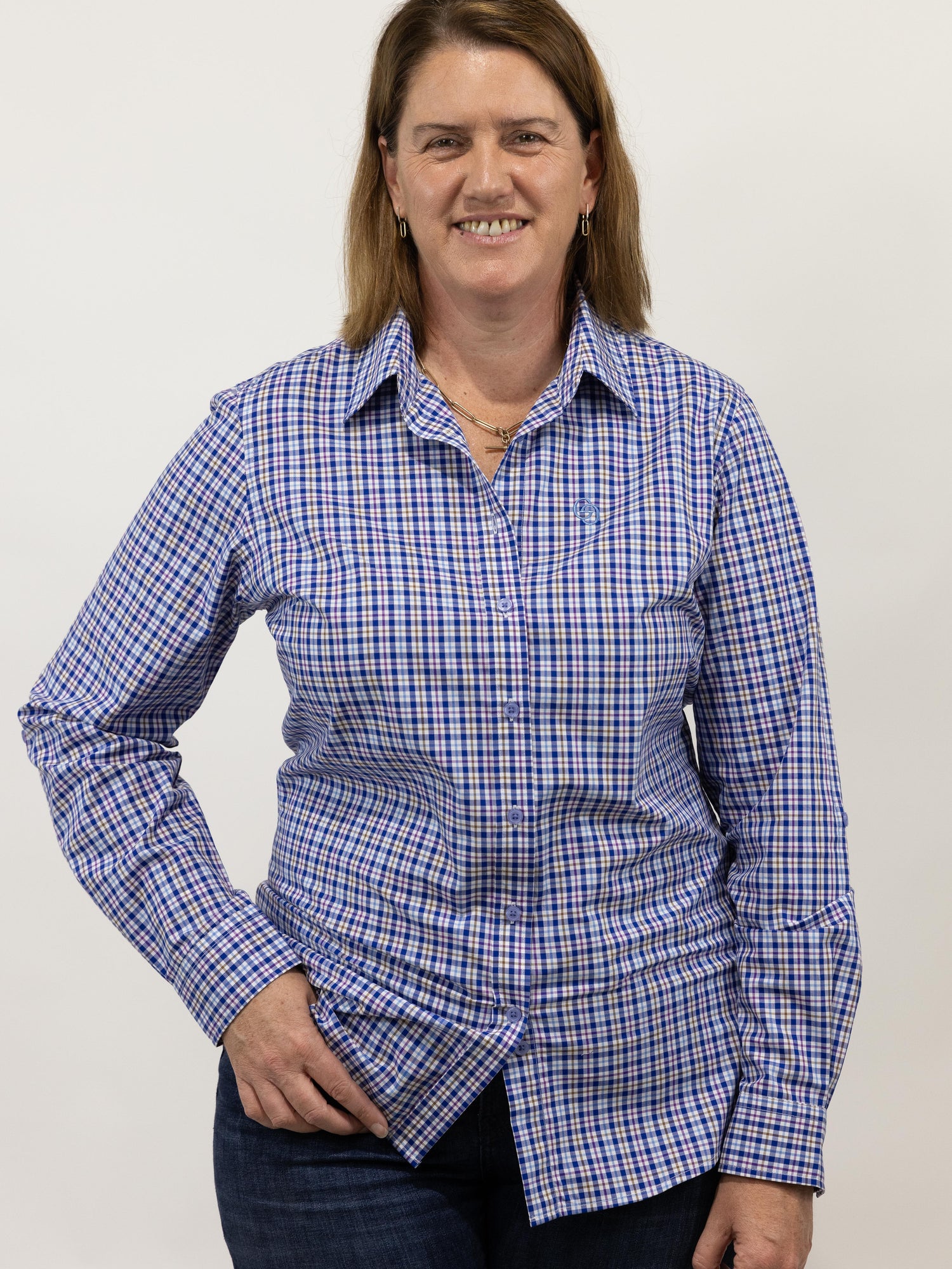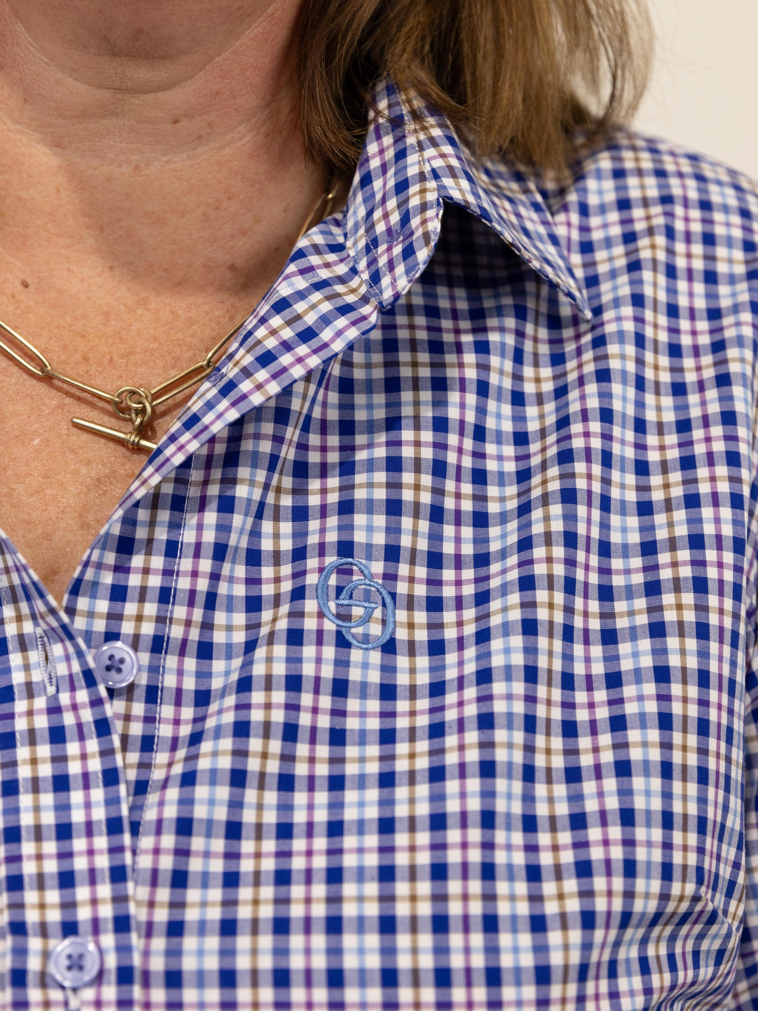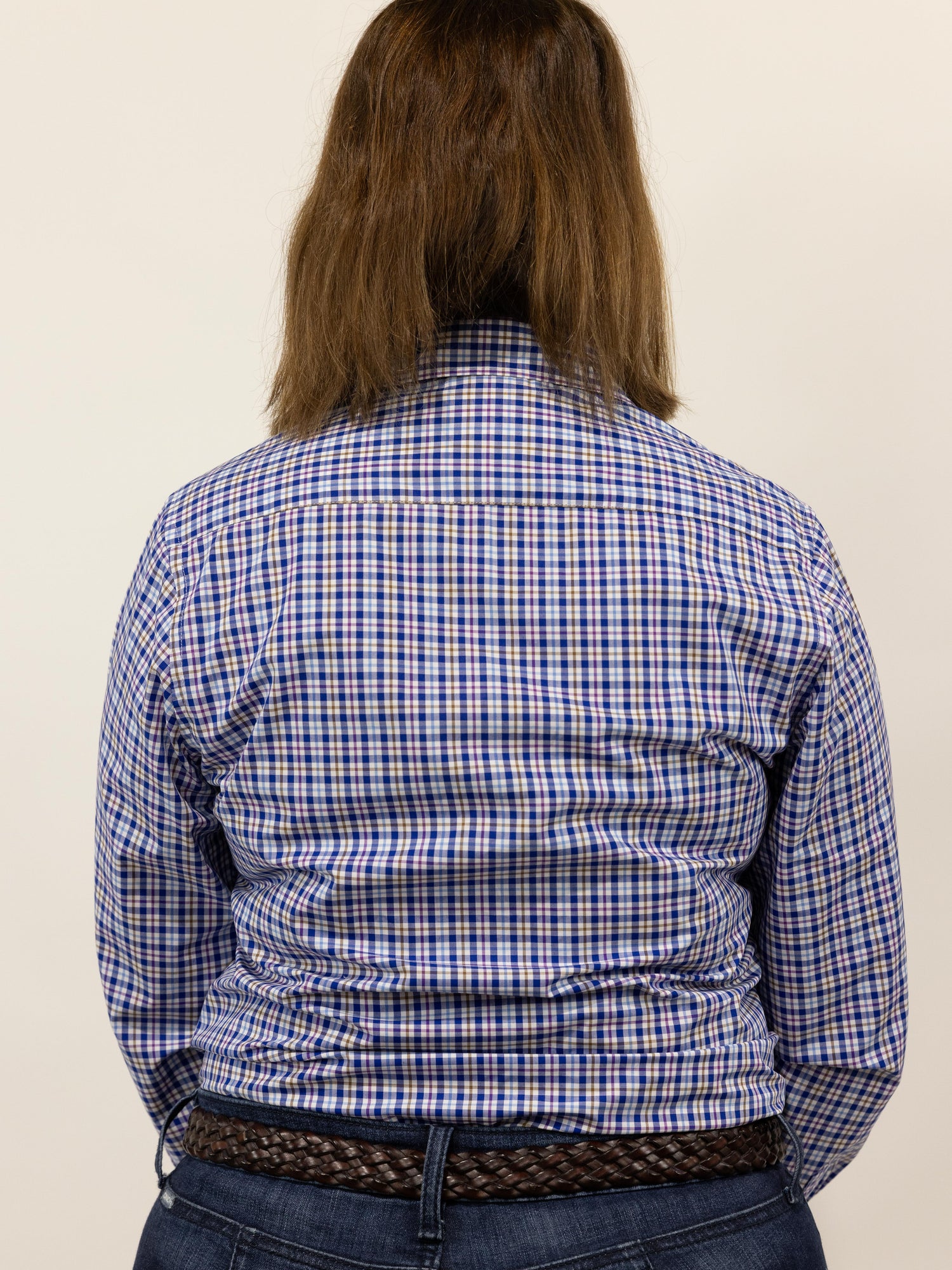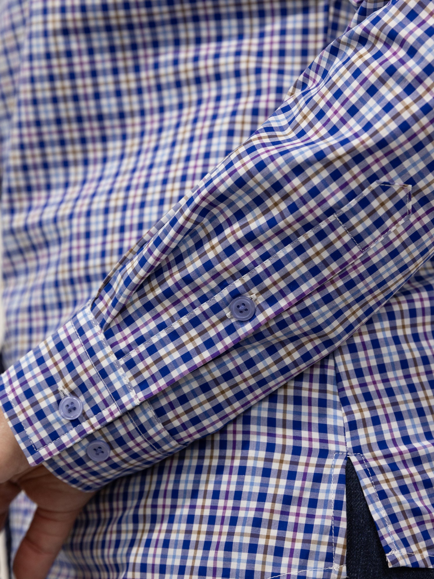This gorgeous shirt has a white background with a predominant navy blue check with a thin line of light blue, brown and purple check within. Made from quality lightweight cotton featuring a full length front placket, roll up sleeve with button and tab, standable collar and the buttons are colour matched blue.