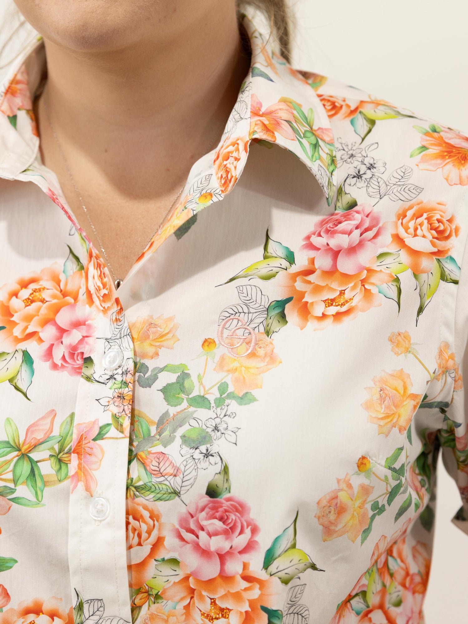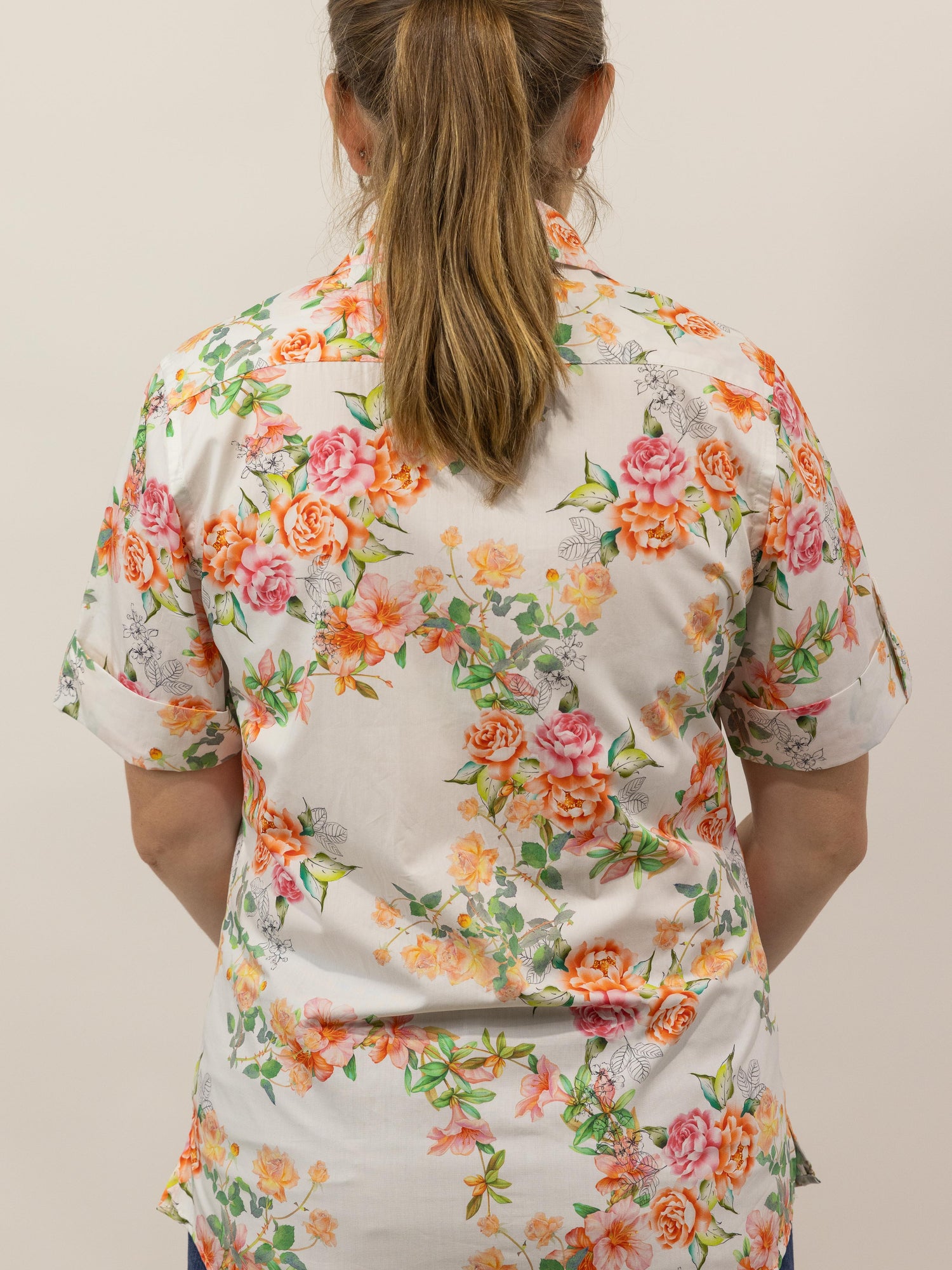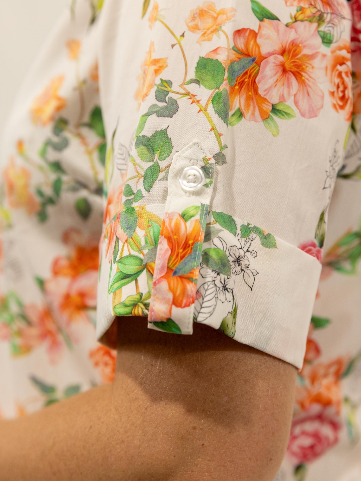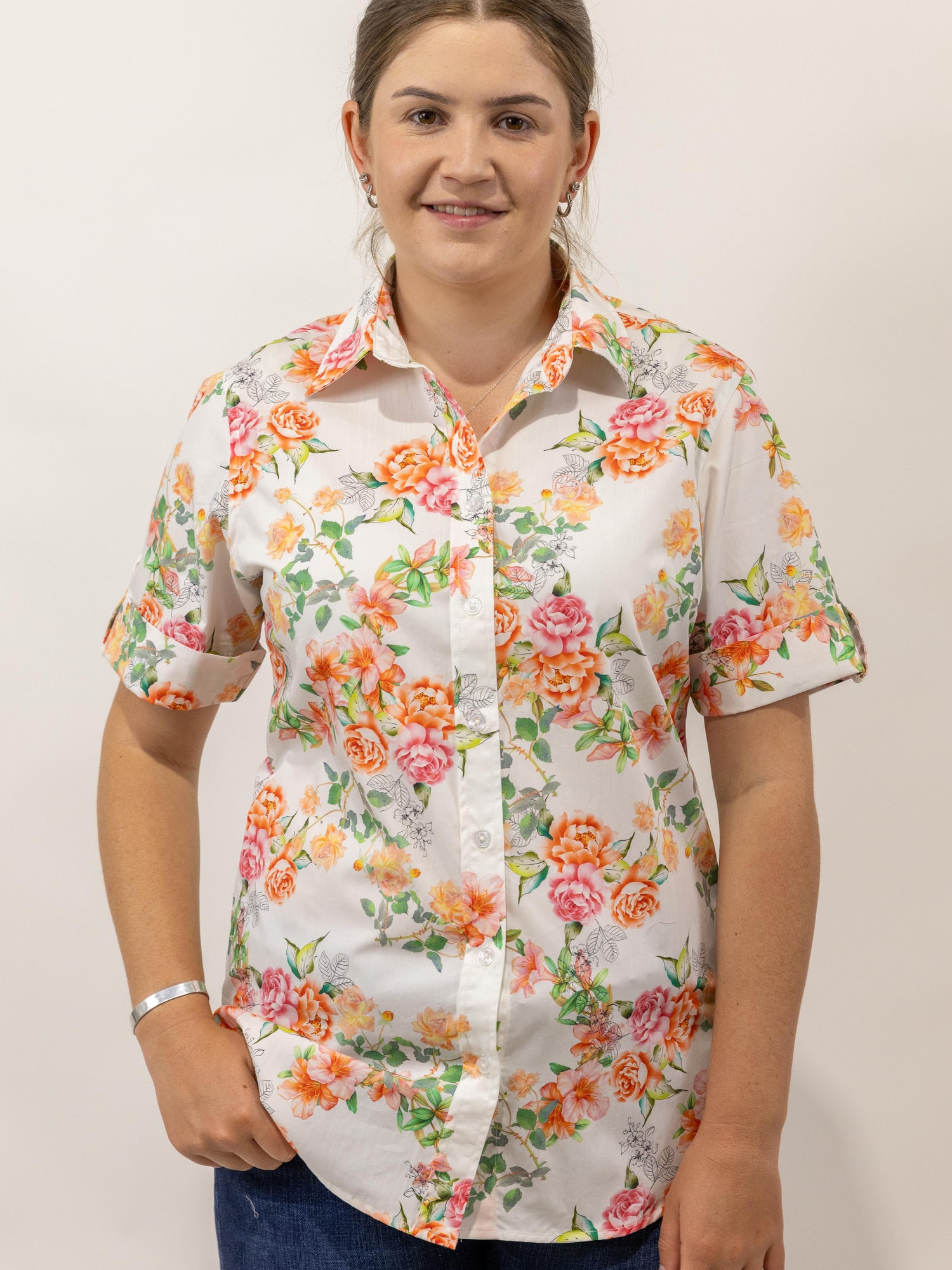 Such a pretty all over floral pattern in autumn style tones of pink and orange on a white background, it is made from a quality lightweight cotton and the buttons are pearlised clear.