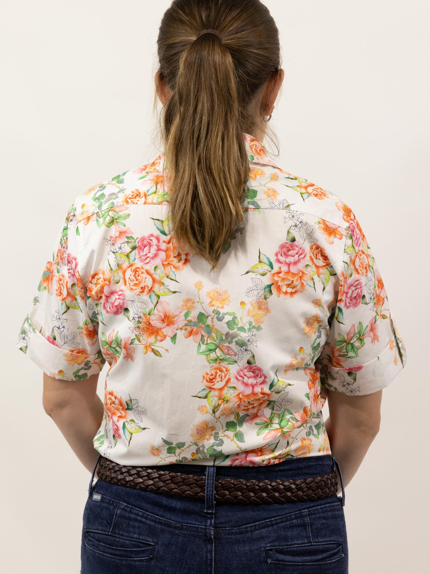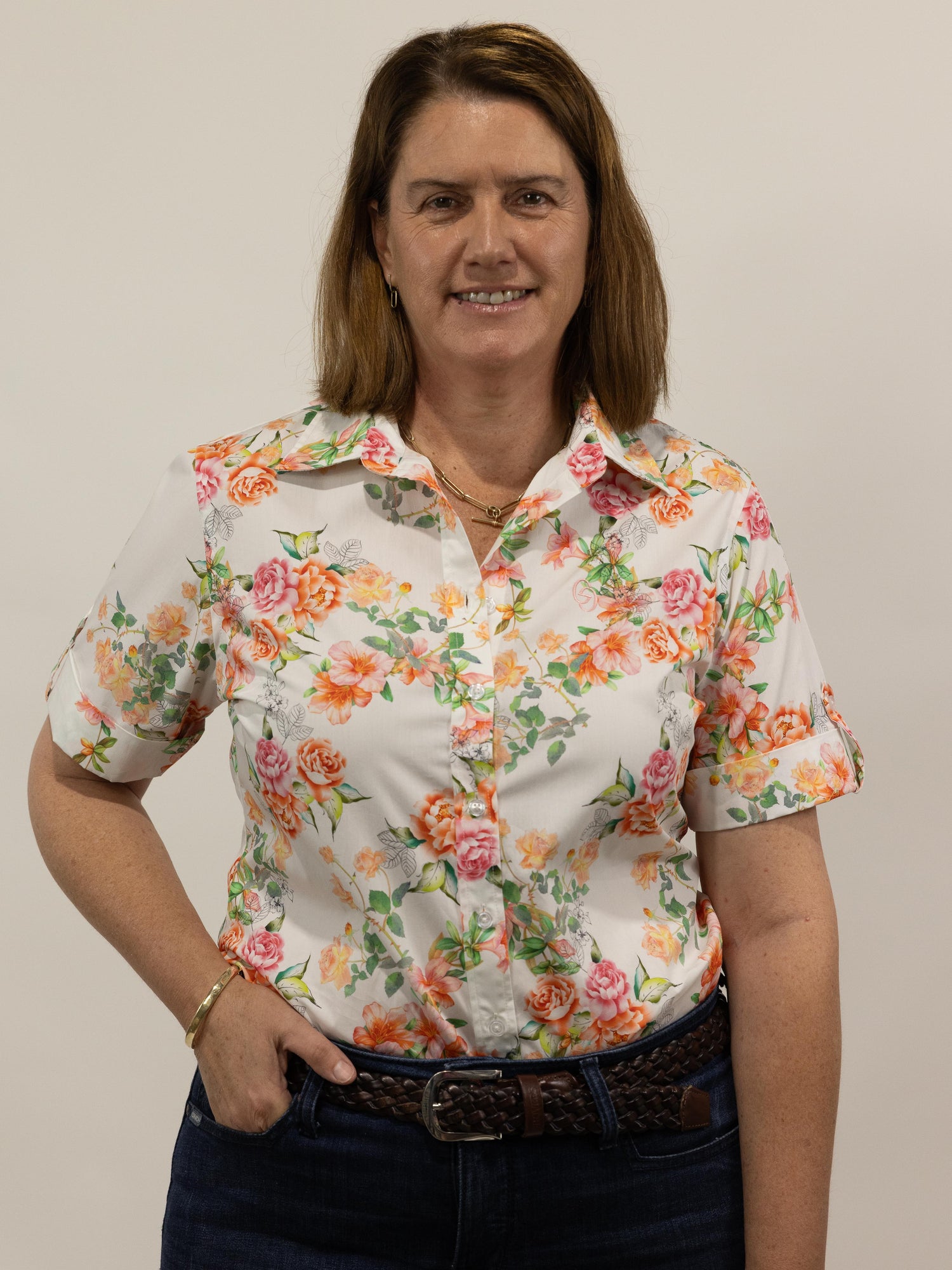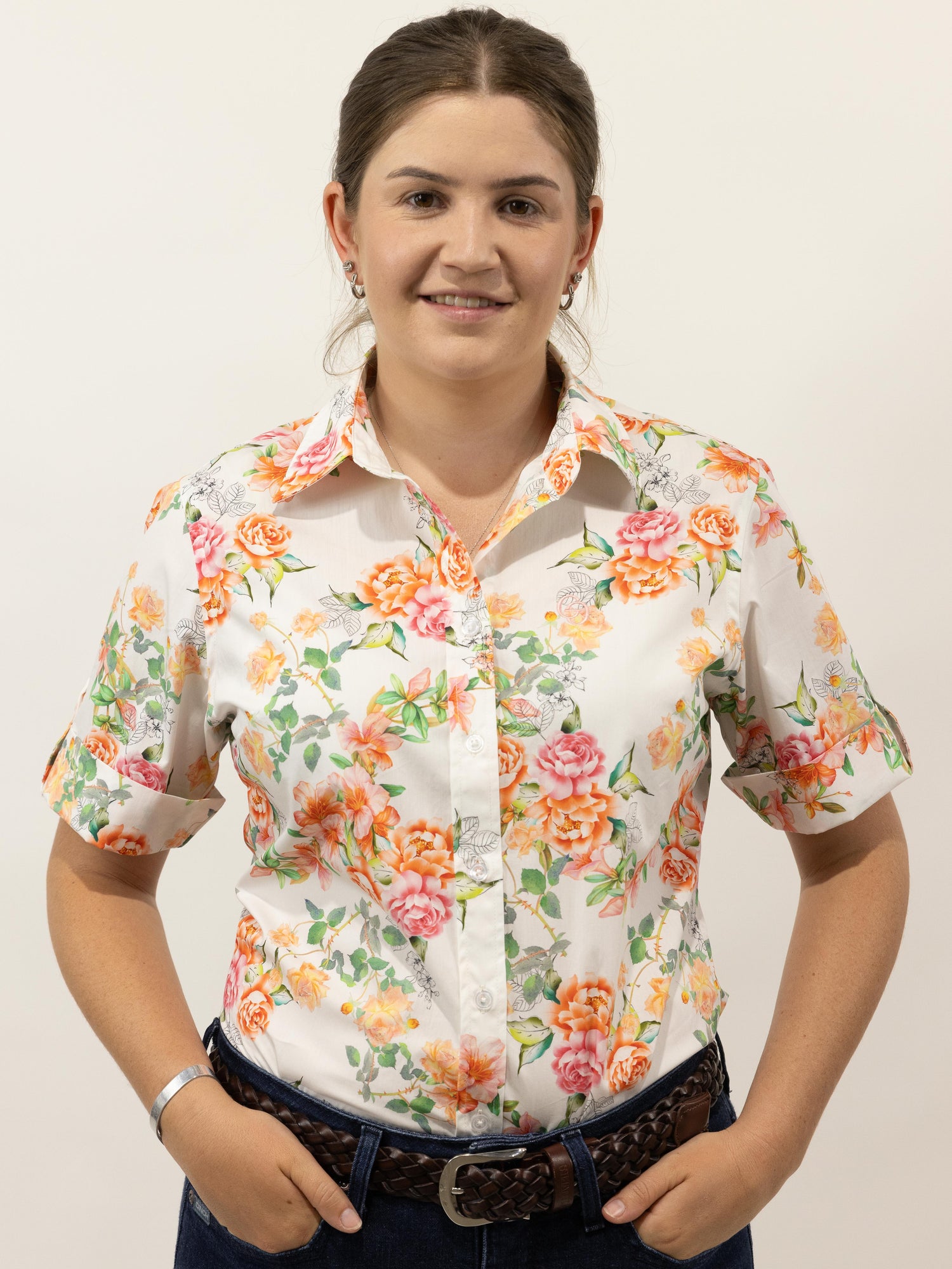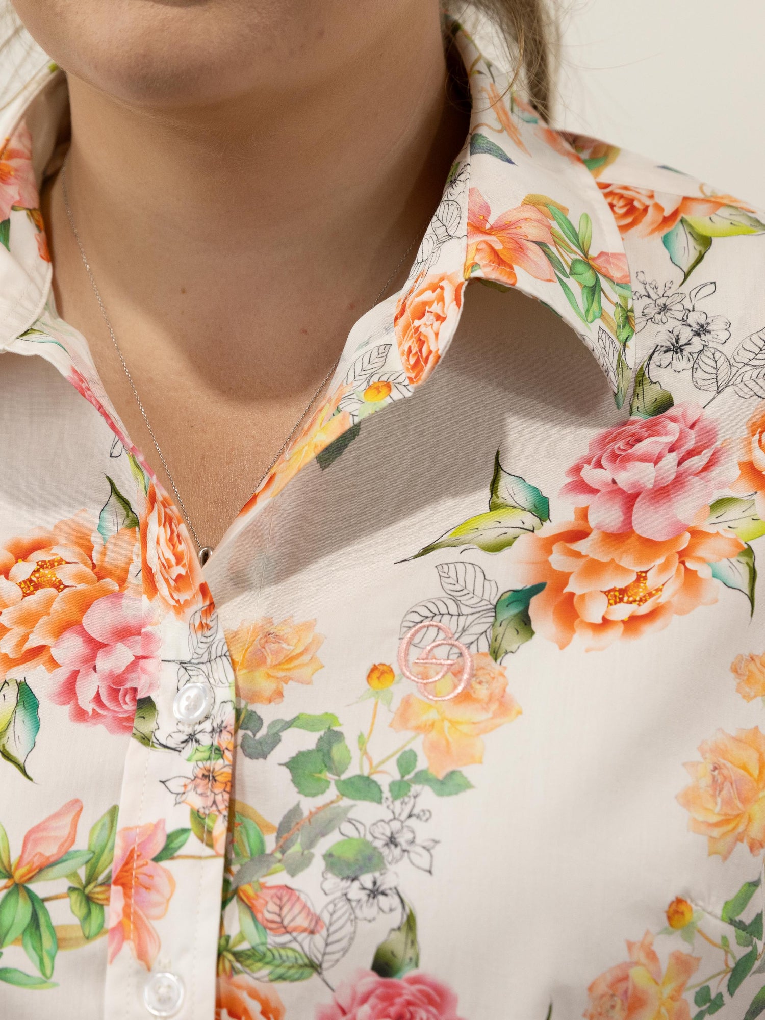 Such a pretty all over floral pattern in autumn style tones of pink and orange on a white background, it is made from a quality lightweight cotton and the buttons are pearlised clear.